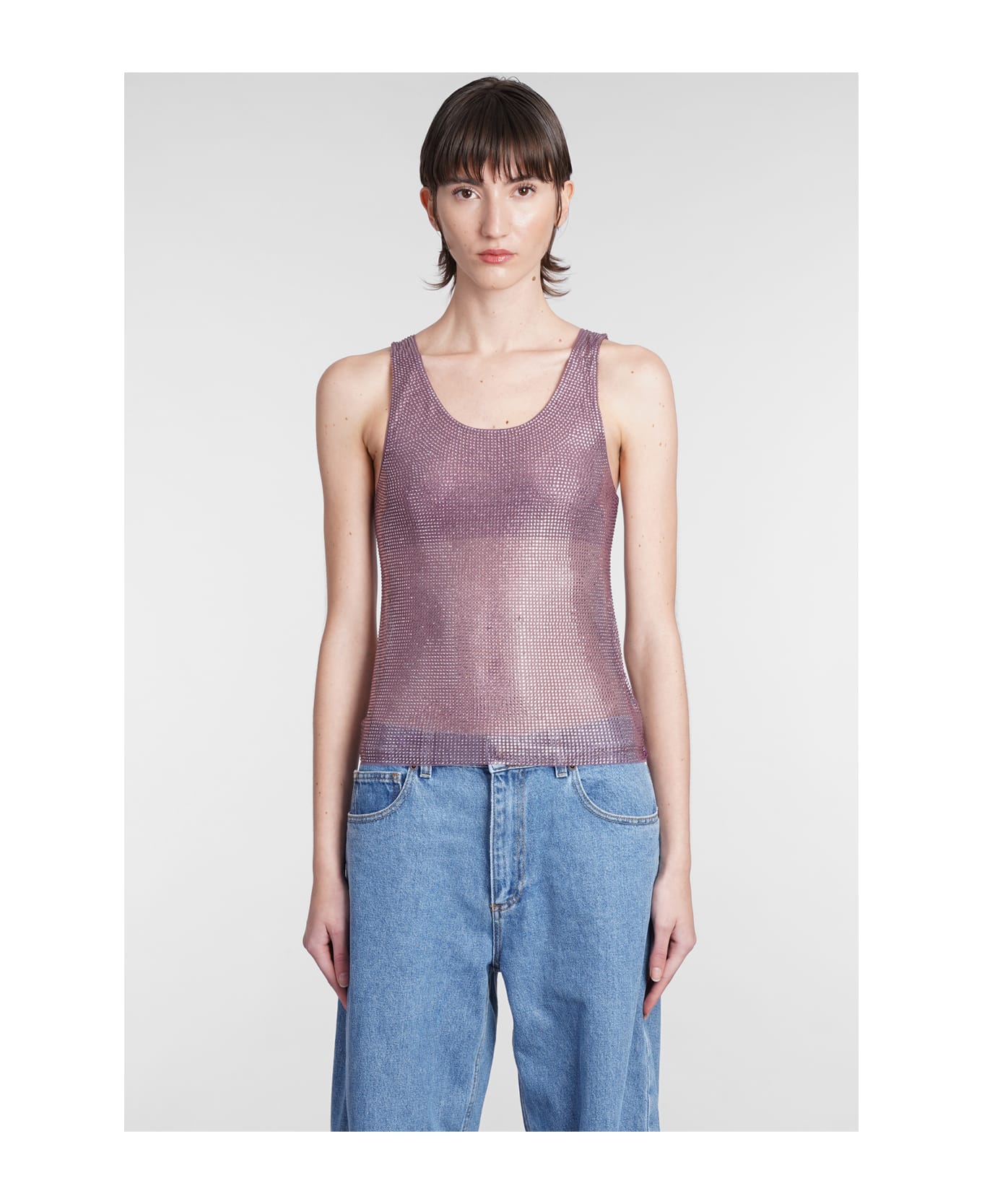 Topwear in Viola polyamide, round neck, cristal details, sleeveless, model is 180 cm and wears size 40, 82% polyester 18% elastan, Made in Italy