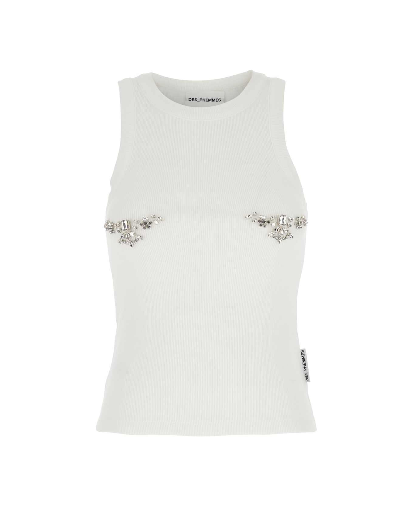 Top White Ribbed design Round neck Sleeveless Crystal embellishments on the front Side logo tag Straight hem Cotton Slim fit
