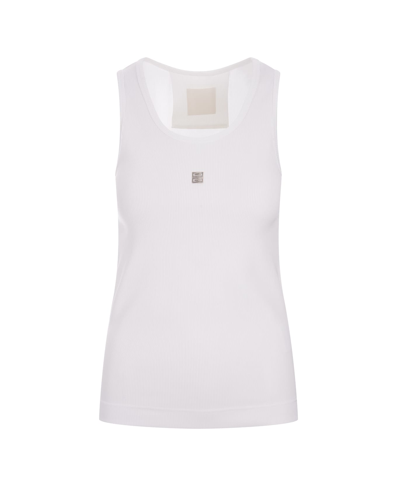 GIVENCHY sleeveless top in white ribbed cotton jersey with 4G logo plaque applied to chest. The design features banded straps, a round neckline and a straight hem.