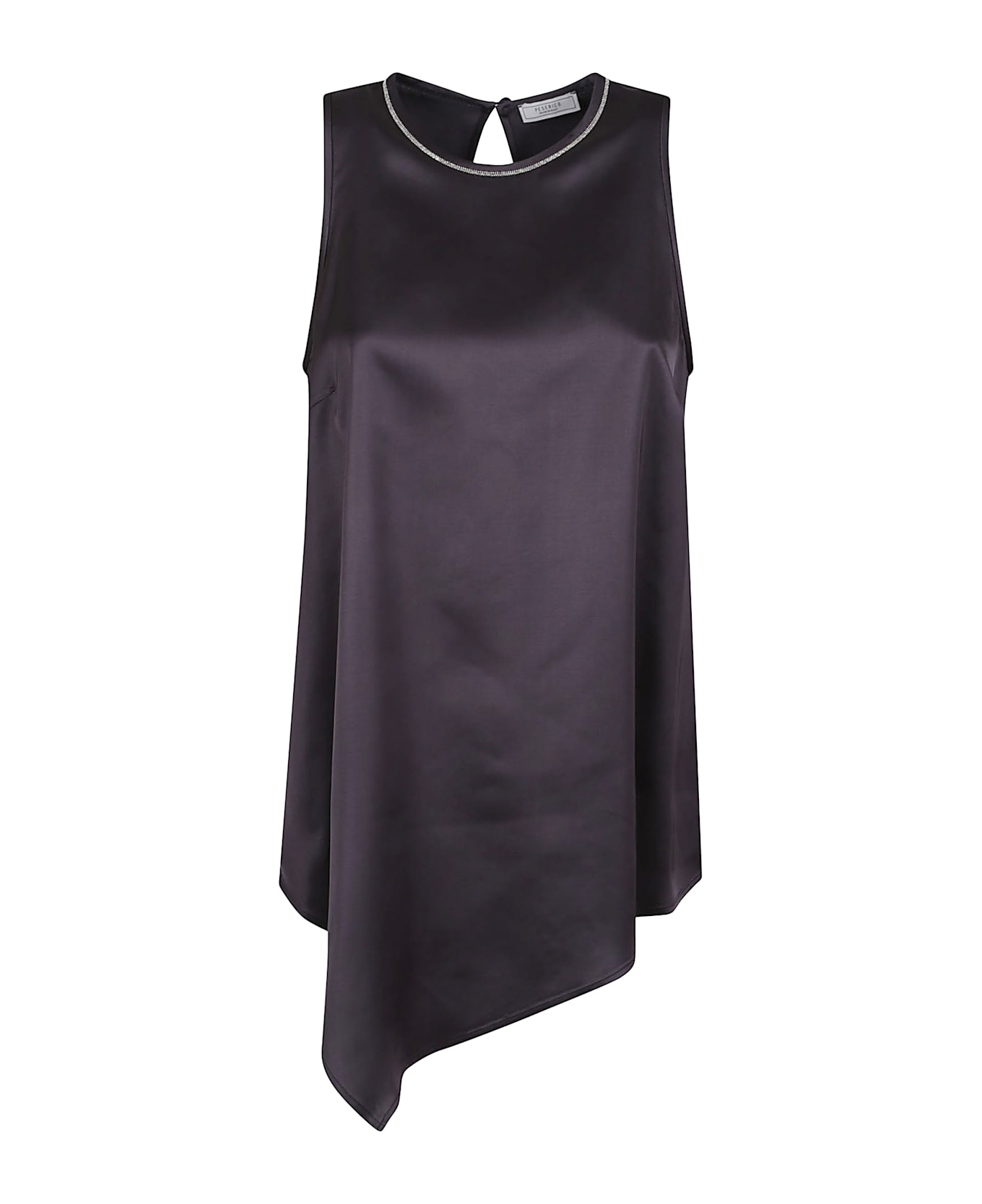 Silk satin top from PESERICO. Crew neck; sleeveless; Regular fit design. Featuring a crew neck embellished with Punto Luce and asymmetric design with handkerchief bottom detail.