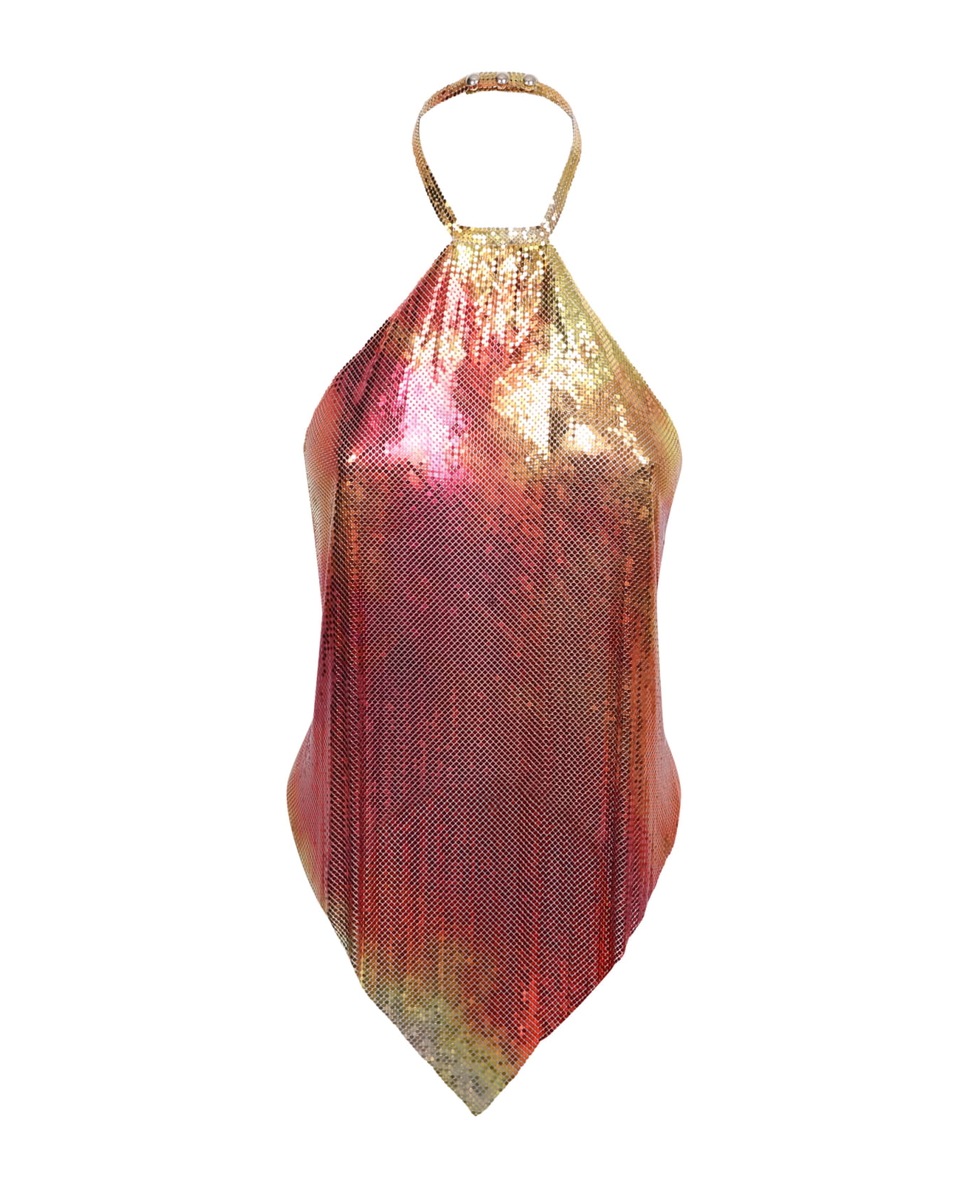 Halterneck. Sleeveless. Rear fastening. Open back. Mesh design. Color: multicolor