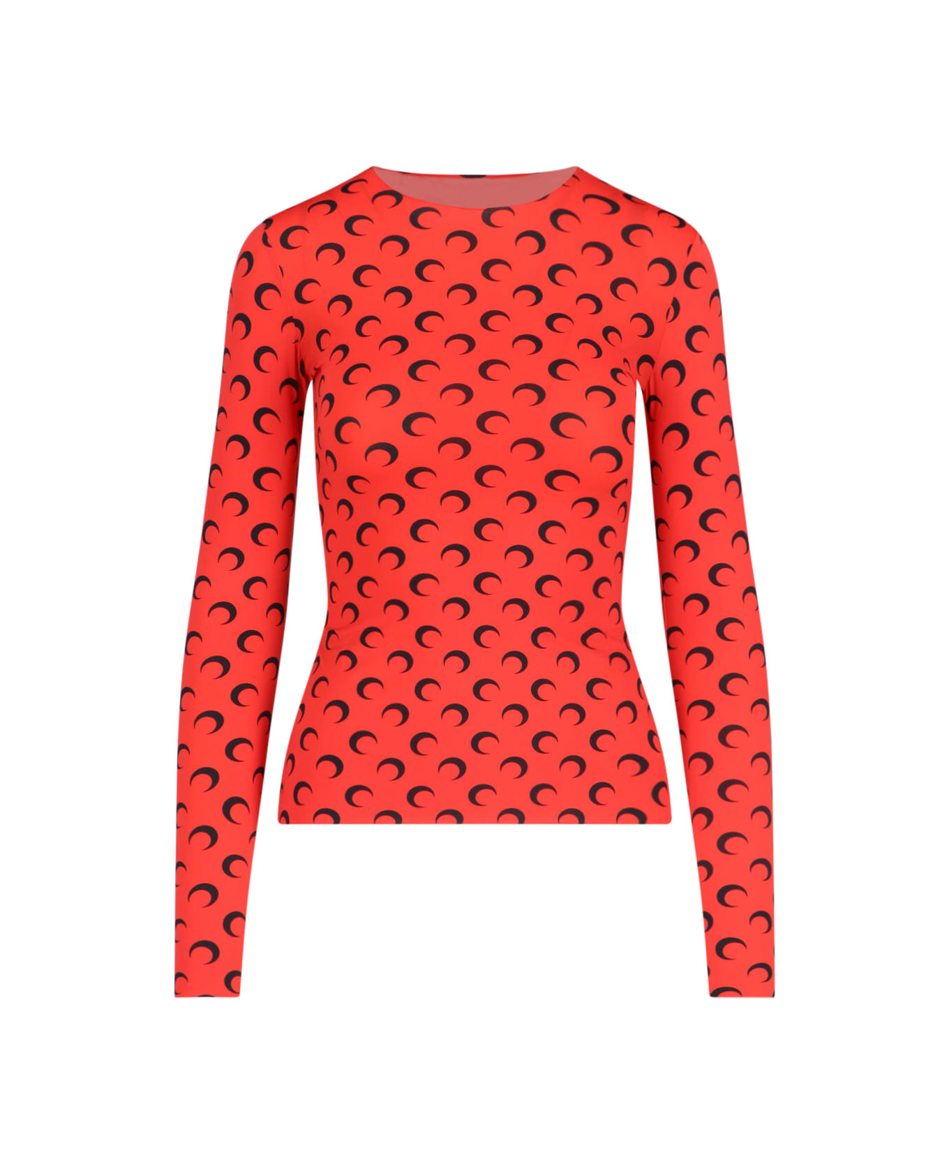 Marine Serre Moon top in red fabric with black logo print pattern, crew neck, straight hem.
