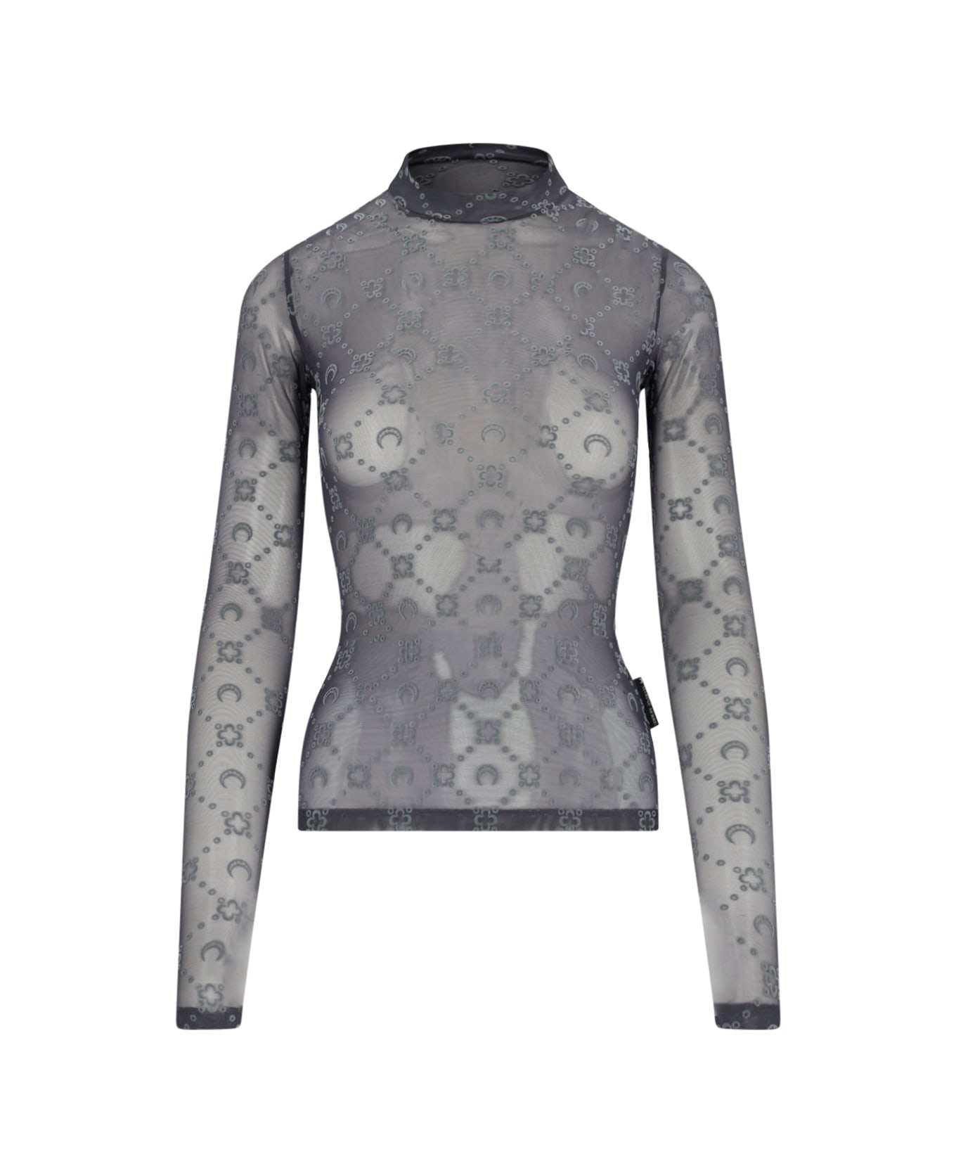 Marine Serre Moonogram Mesh Flock top in gray stretch nylon, semi-transparent, logo print pattern, high neck, side logo label, straight hem. Composition: 86% Polyamide, 14% Elastane