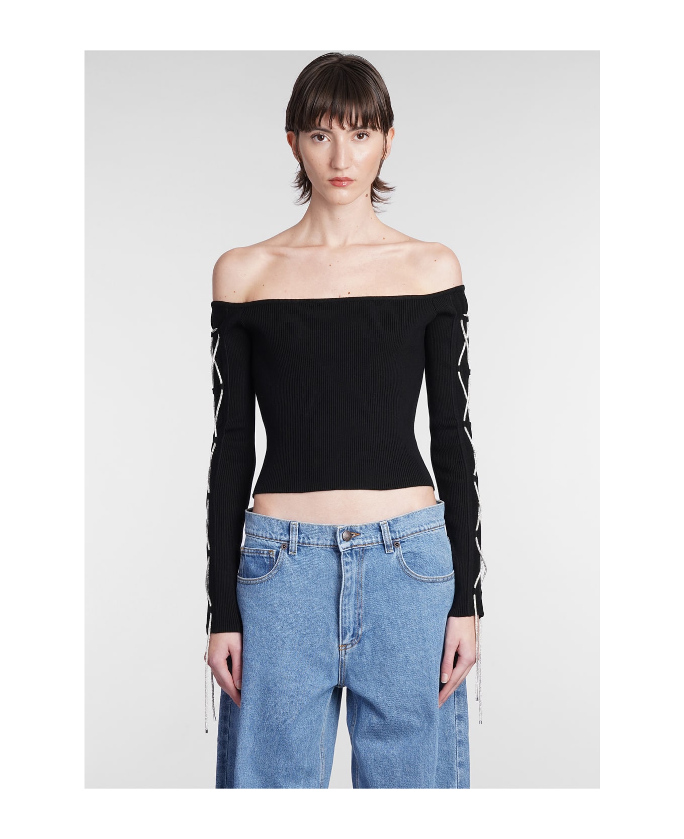 Topwear in black cotton, off shoulders, long sleeves, lace up, crystals detail, 88% Cotton, 12% elastan, Model is 180 cm and wears 38