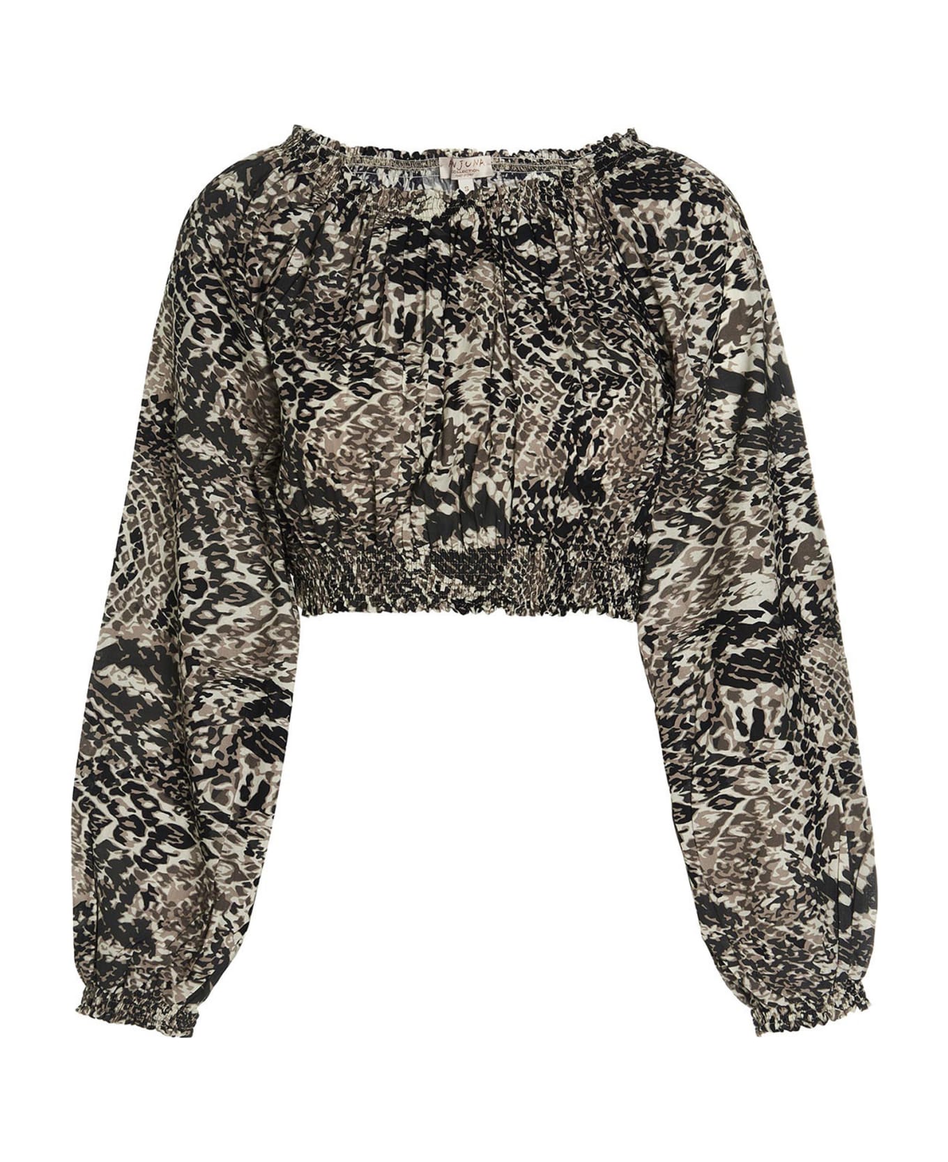 'Tullia' off-the-shoulder cotton top with all-over print, elastic neckline and waistband, and long sleeves with elastic cuffs.