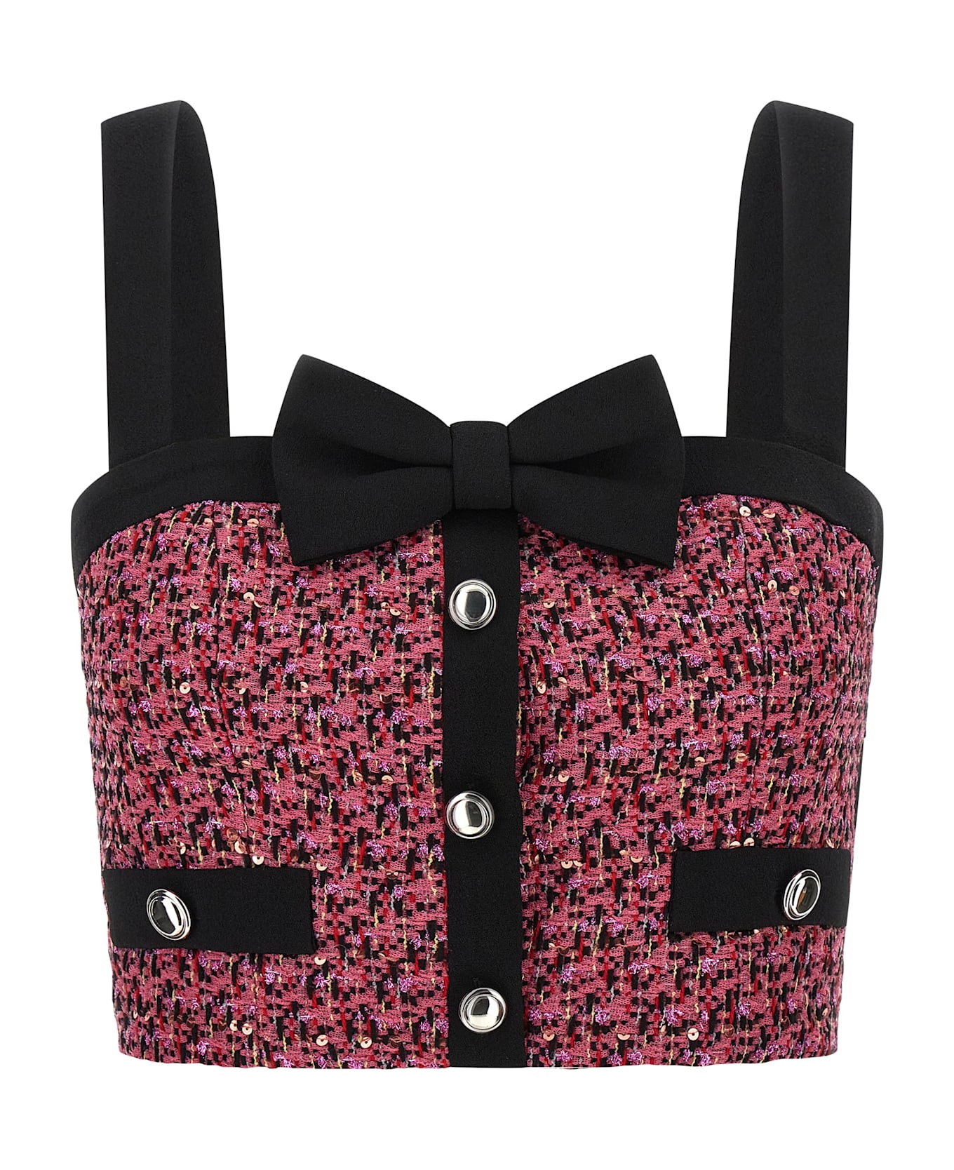 Wool blend tweed top with all-over micro-sequin embroidery, front metal buttons and bow detail, and shoulder straps.
