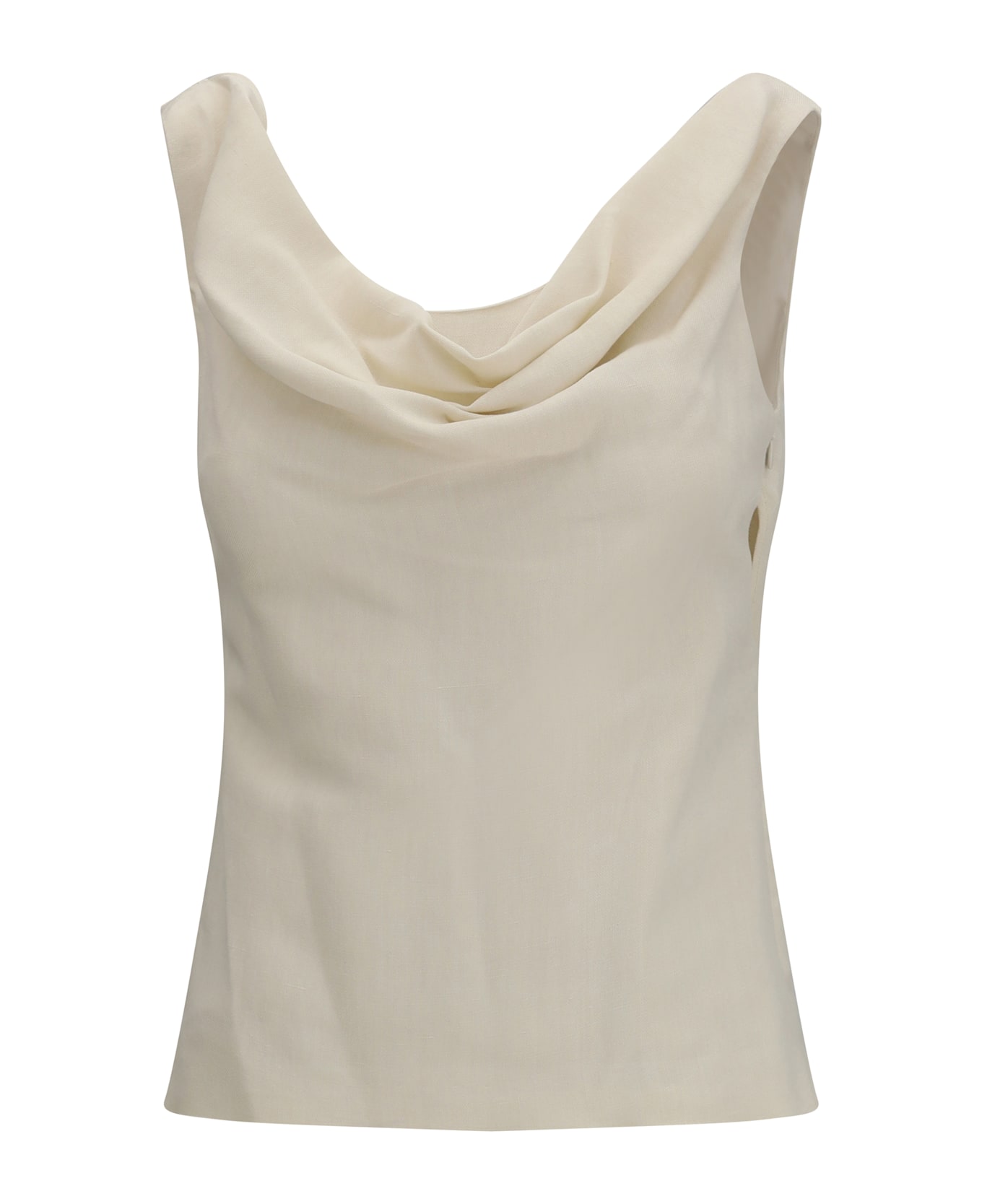 The viscose and linen twill top by brunello cucinelli combines lightness and refinement in a sophisticated garment. featuring a wide neckline and a concealed zip closure, it has a neckline at the back that adds an elegant and feminine detail. the silk-blend crepe lining ensures comfort and fluidity, making it ideal for chic and contemporary looks.