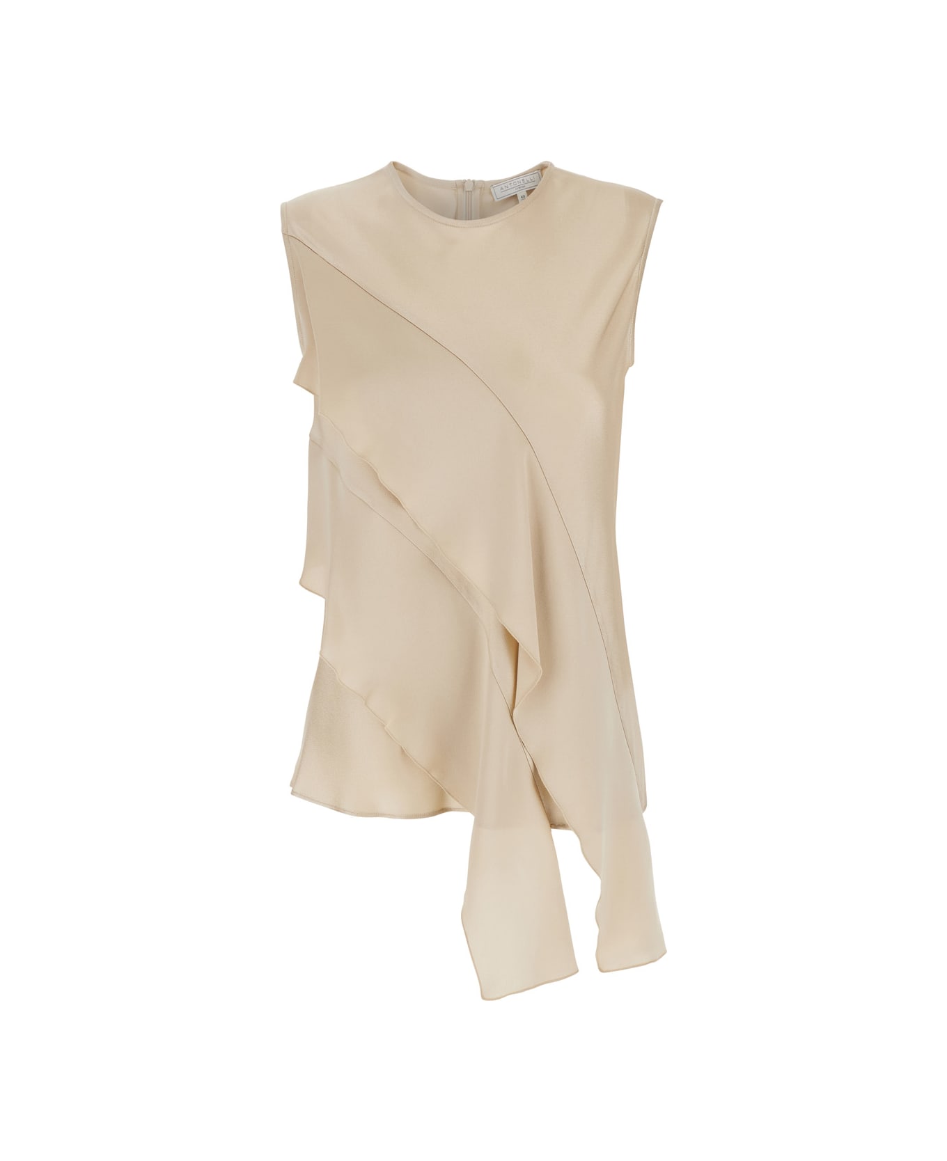 Top Beige Crewneck Sleeveless Front asymmetric ruffle Rear zip closure Satin Regular fit