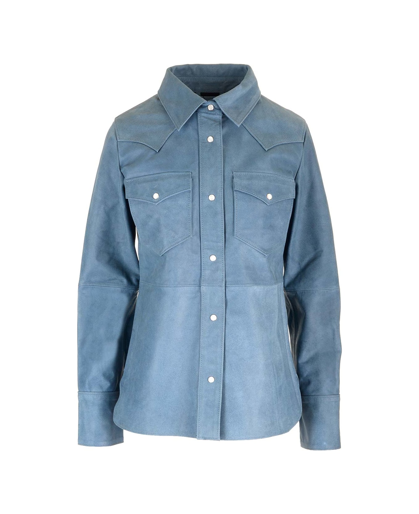 Western style shirt from Stand Studio in washed indigo blue leather, with automatic buttons, classic collar, standard fit.
