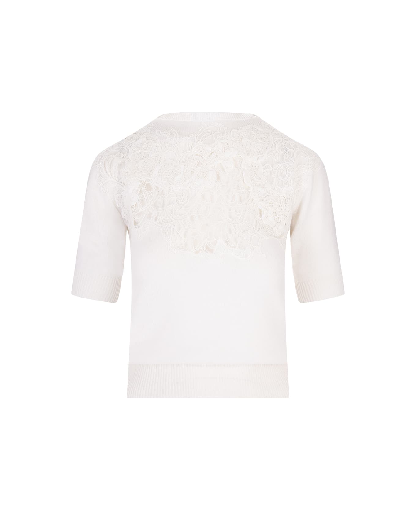Ermanno Scervino top in pure white cashmere knit finished on the neckline with a precious tone-on-tone lace insert that allows a glimpse of the skin. Slim fit model with round neckline, short sleeves, straight hem and ribbed trim. A white floral lace appliqué is sewn on top of the lace on the neckline.