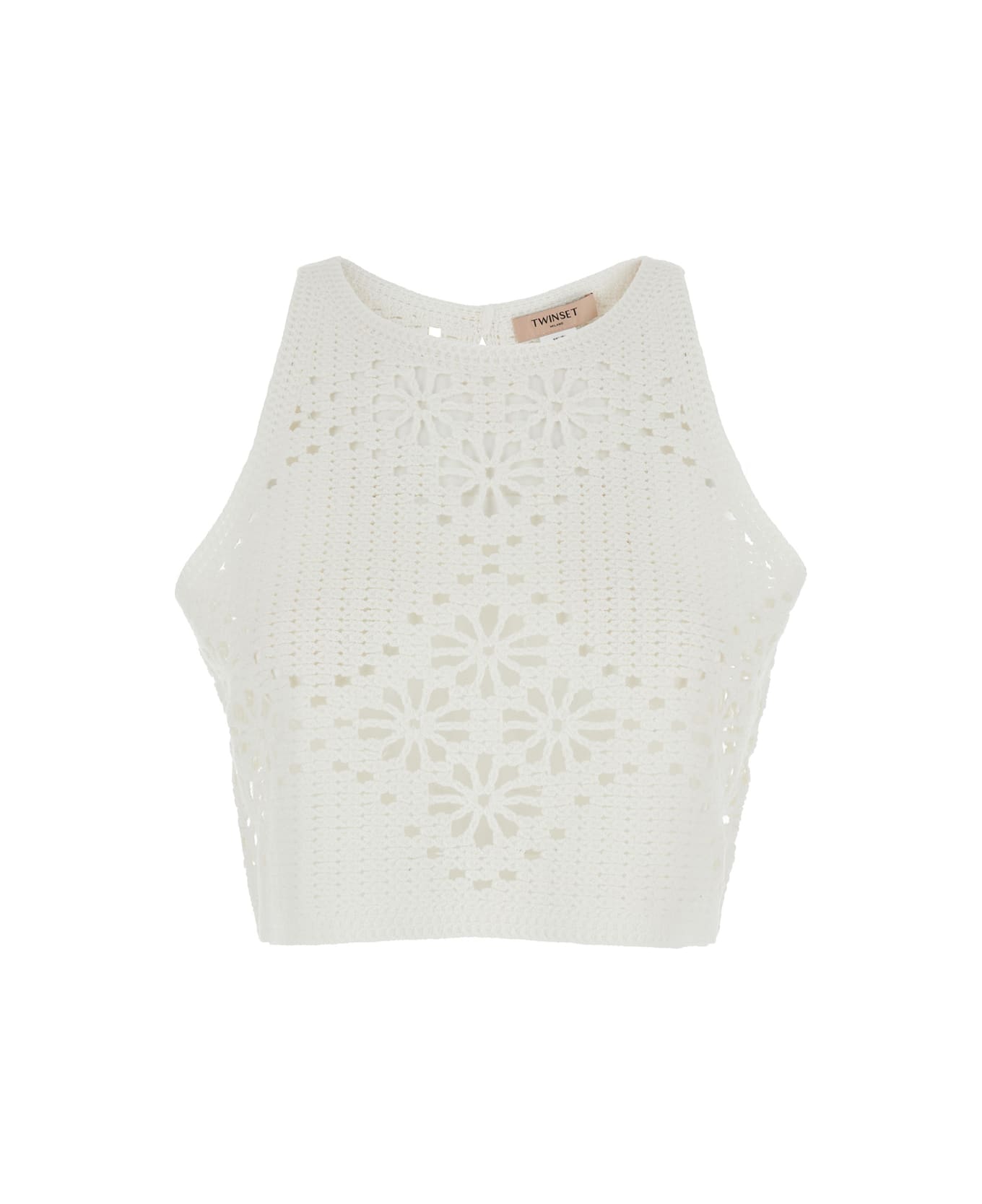 White Sleeveless Crochet Cropped Top With Logo Plaque On The Rear In Cotton Woman