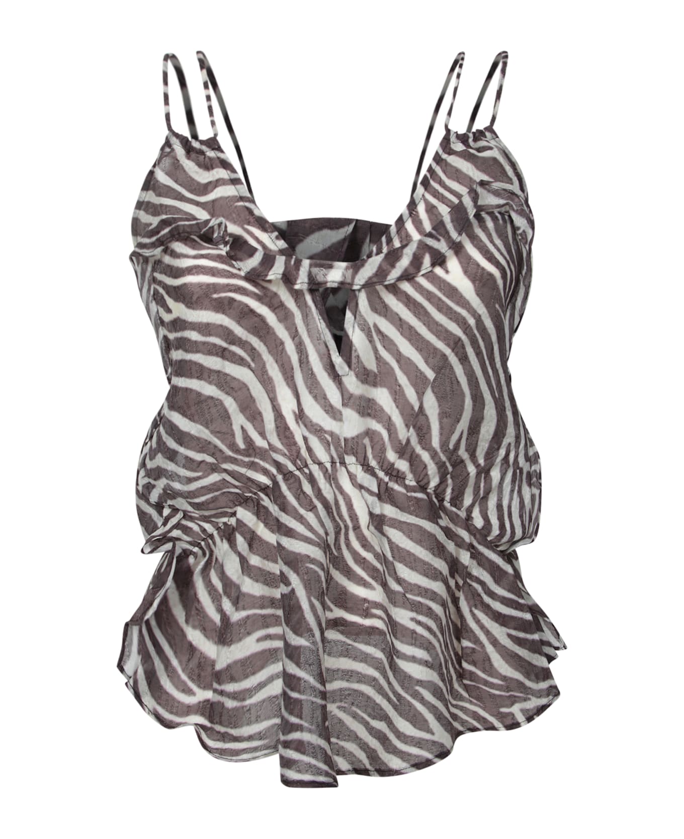 This blouse exudes bold contemporary charm, pairing a dynamic zebra print with playful ruffles that add movement and femininity to the ensemble.
