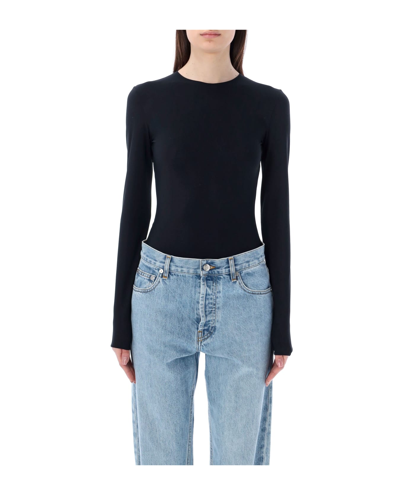 Viscose Bodysuit By Maison Margiela. Featuring: Round Neck Long-sleeves Four White Stitches At Rear Collar Crotch Fastening Model Is 1,72 M Tall And She Is Wearing Size 40