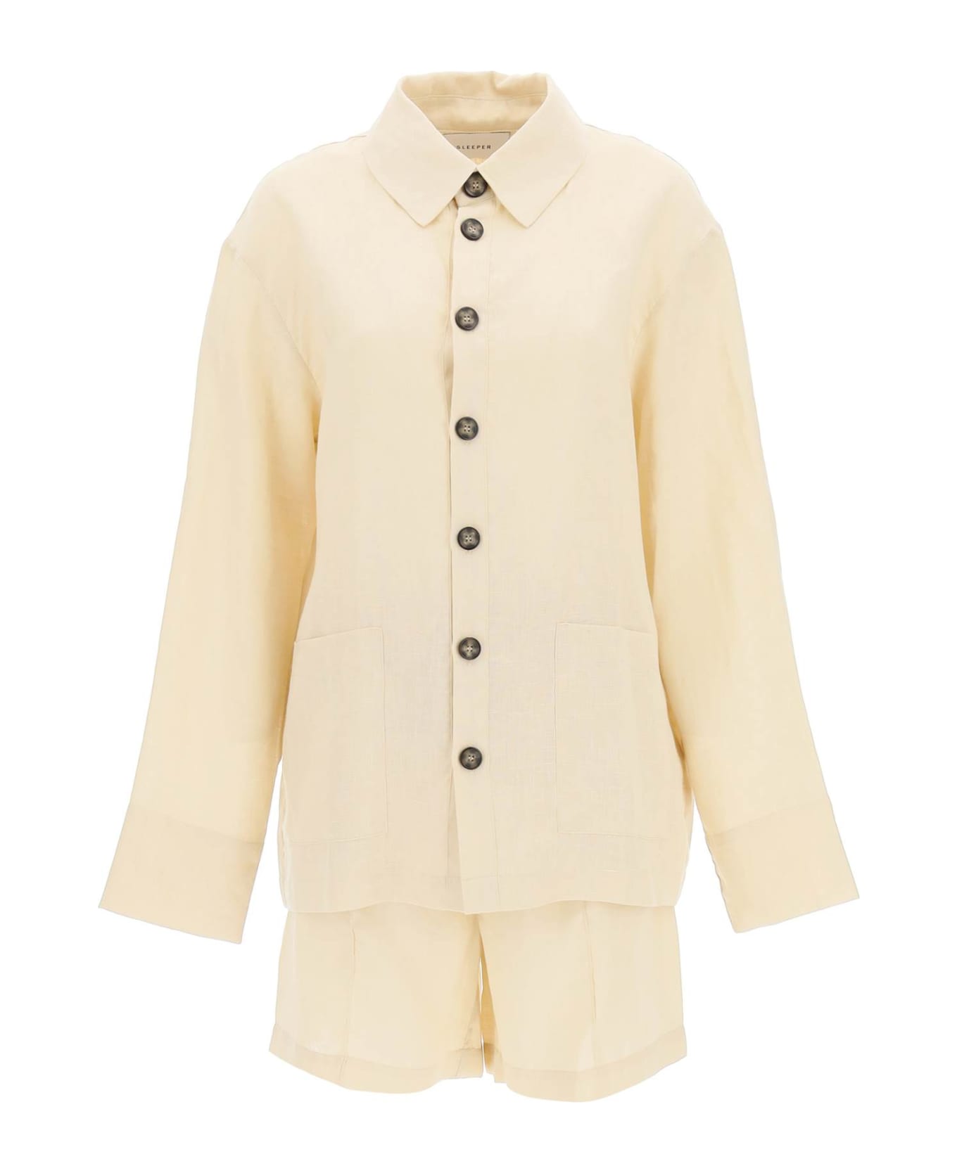Sleeper pajama set in pure linen, composed of a shirt top with button-up closure and two patch pockets, and short pants with elasticated drawstring waist, centre leg pintuck and side pockets. Relaxed fit. The model is 177 cm tall and wears a size XS.