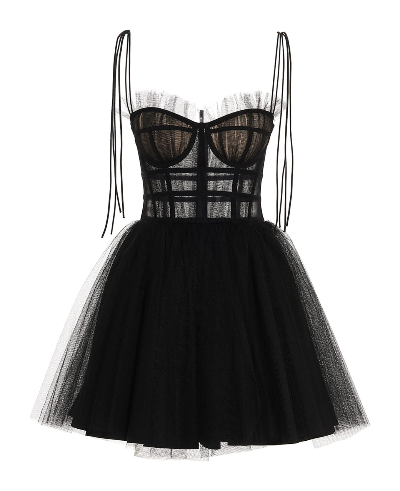 Tulle minidress with flounced skirt, sheer bodice with splints and an unseen zip closure.
