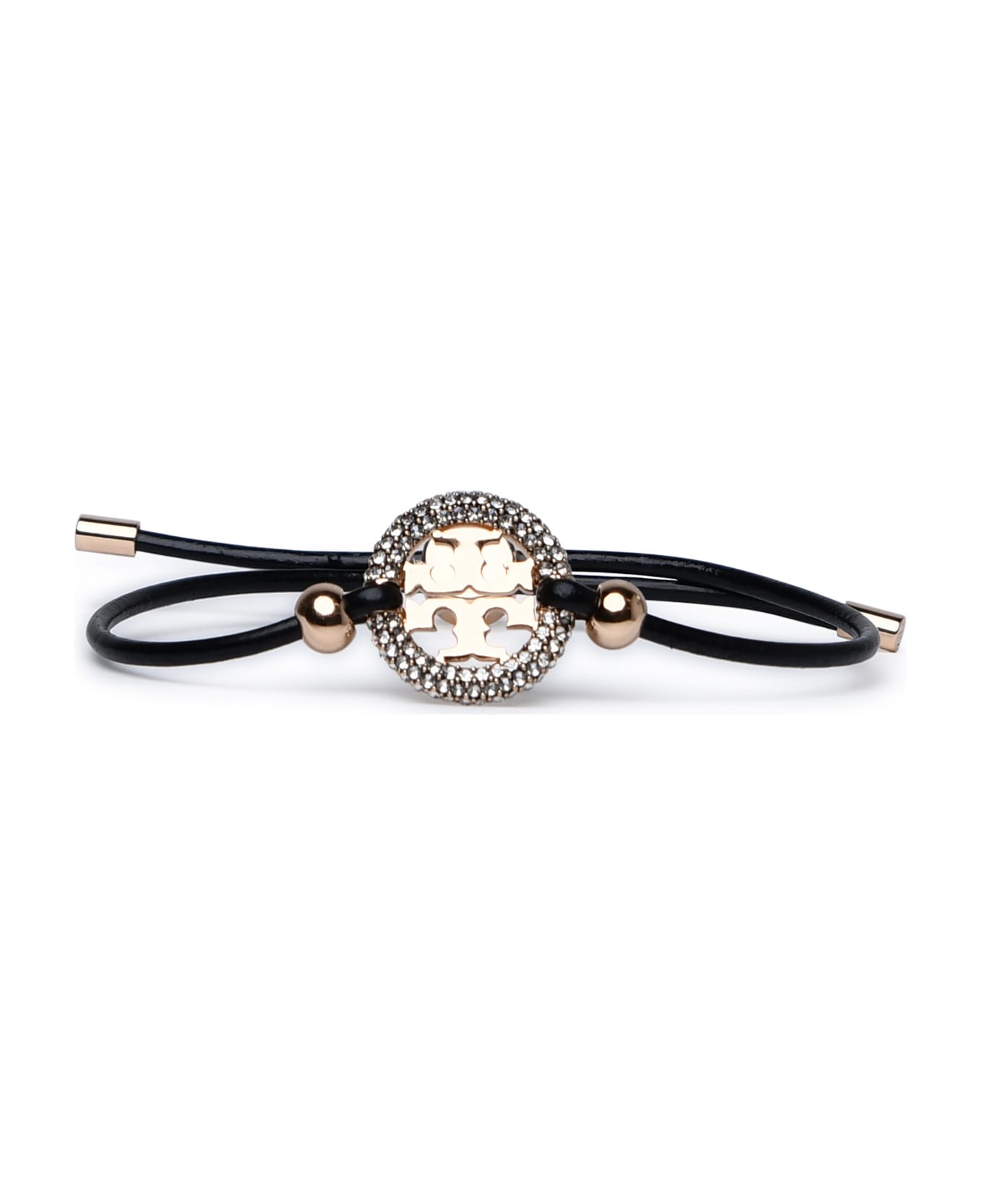 Bracelet in leather and gold-plated brass with jewel detail, sliding closure, double 'T' logo pendant with rhinestone detail, nickel free.