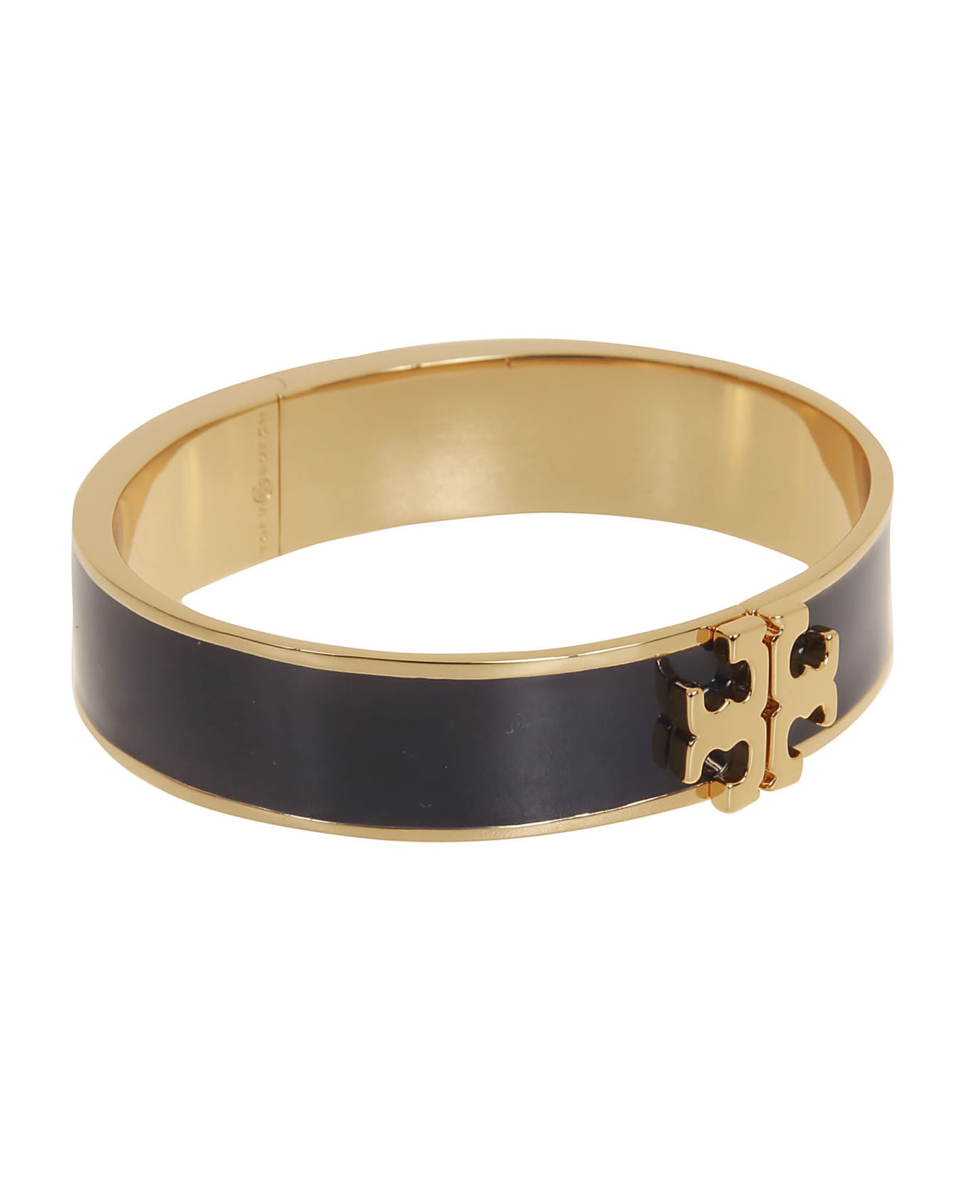 Enameled Raised Logo Bracelet from Tory Burch: Black/Gold Enameled Raised Logo Bracelet with signature double t logo and hinge closure.