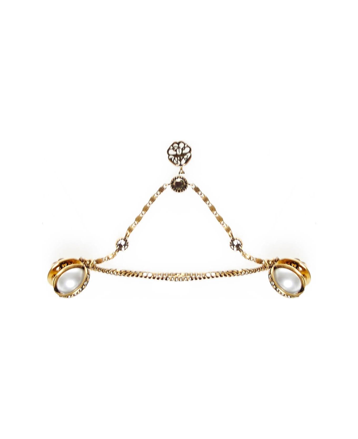 Unusual shape and vintage allure for the brass brooch by Alexander McQueen. The pearls imprisoned in the golden cages, illuminated by crystals, are a must-have of the refined outfit, based on a double-breasted blazer and cigarette trousers.