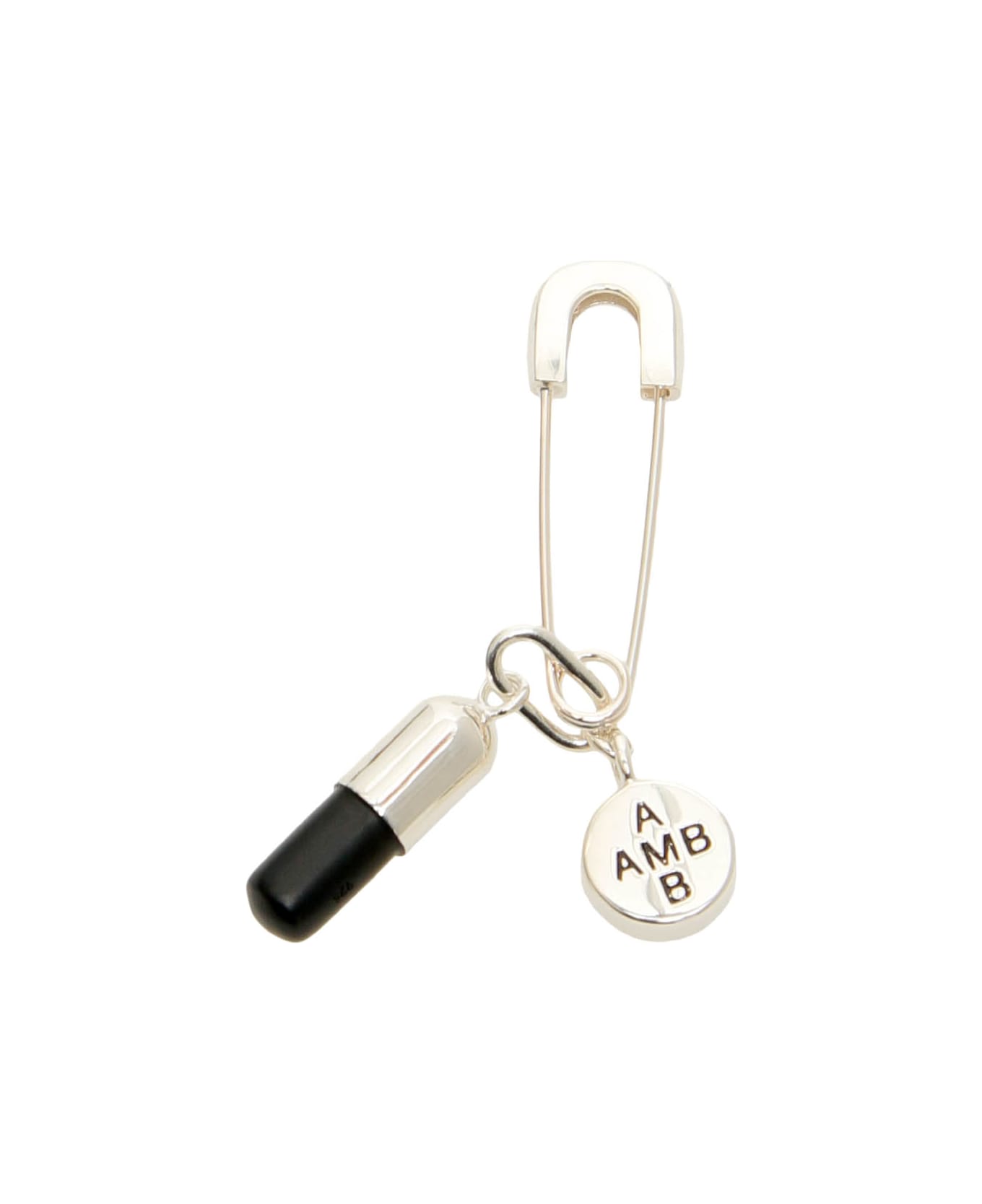 Ambush Pill Charm handcrafted piercing-style single silver earring in the shape of a safety pin with two-tone pill charm and AMB charm. For pierced ears.