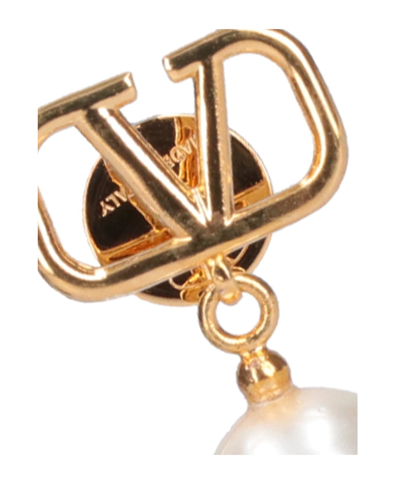 Valentino earrings with pearls 'VLogo' in gold brass, logo on the front, pendant pearls in white resin, butterfly closure at the back.