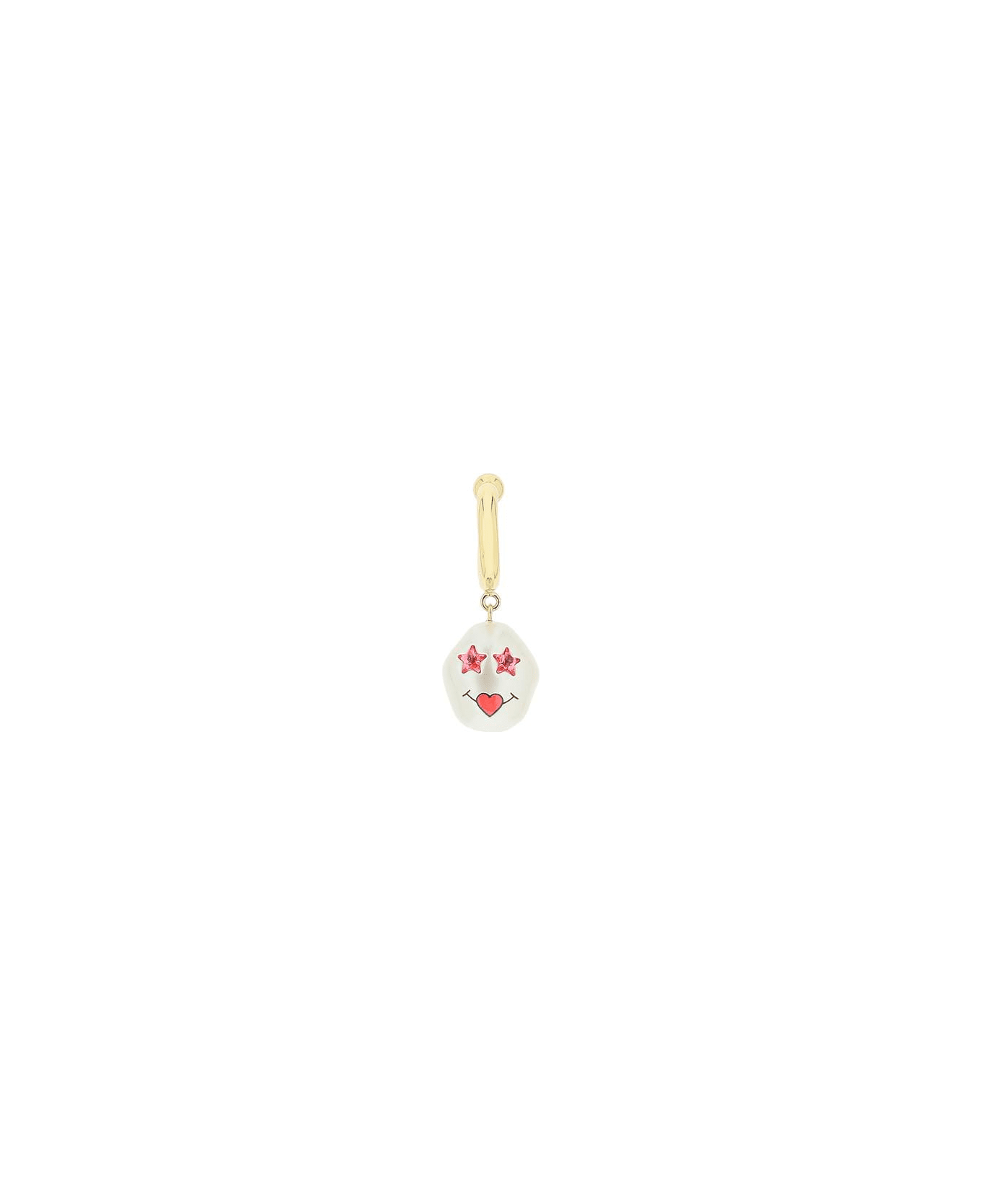 Star Cotton Candy single earring by Safsafu with 24K gold plated brass semicircle and hanging faux pearl with heart print and star-shaped embedded Swarovski crystals. Rear closure with pin and sphere, for pierced earlobe.