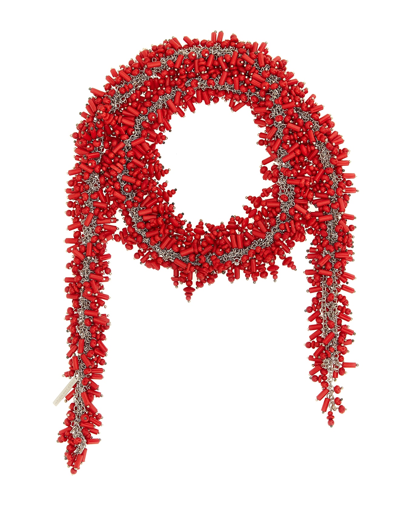 Embroidered Scarf' necklace in copper, acrylic and brass with embroidered beads and elements of electroformed shape, scarf model.