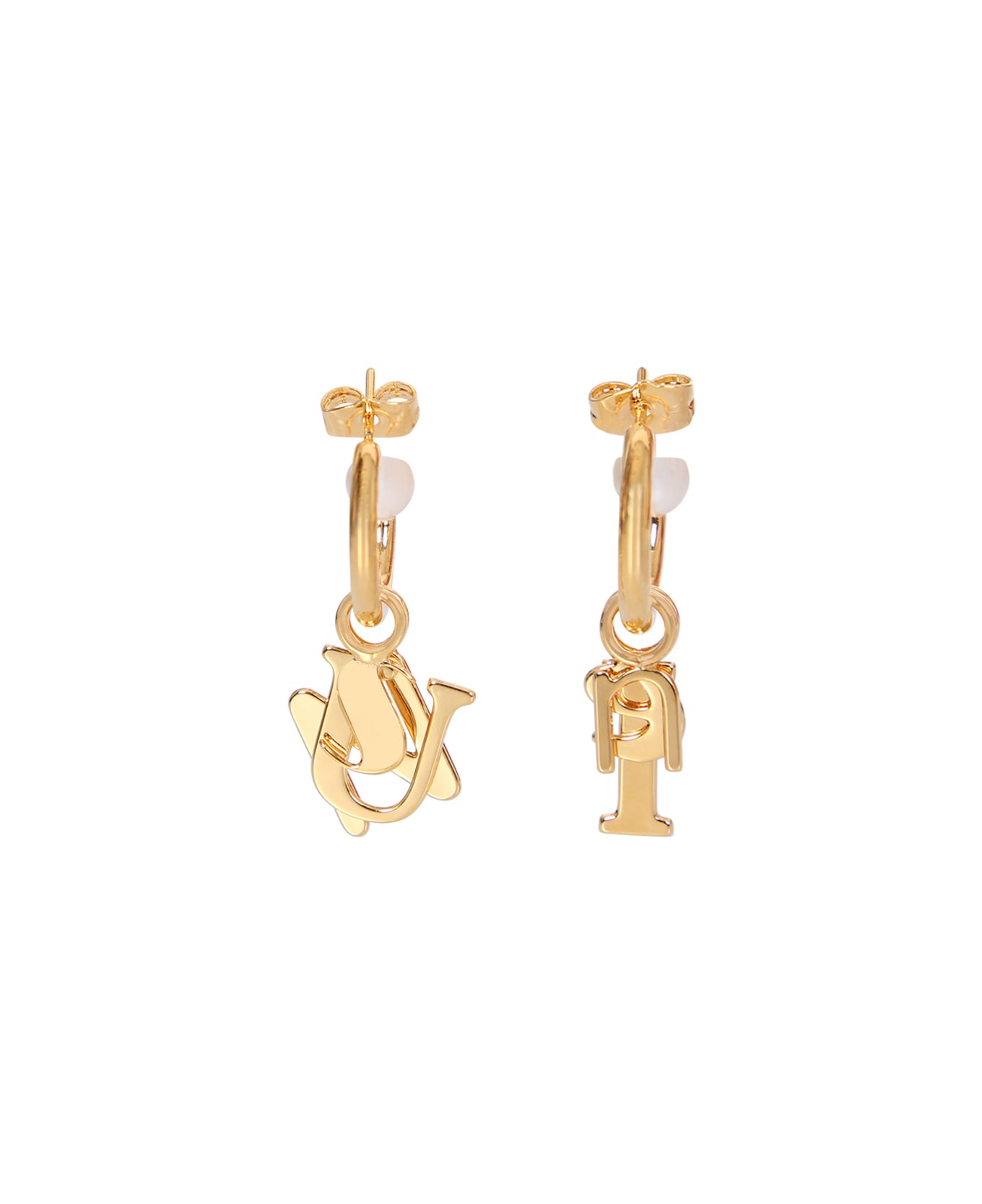 A sophisticated addition to any ensemble, these SUNNEI dangling earrings feature the label's distinctive logo with a gleaming gold finish, emblematic of modern elegance.