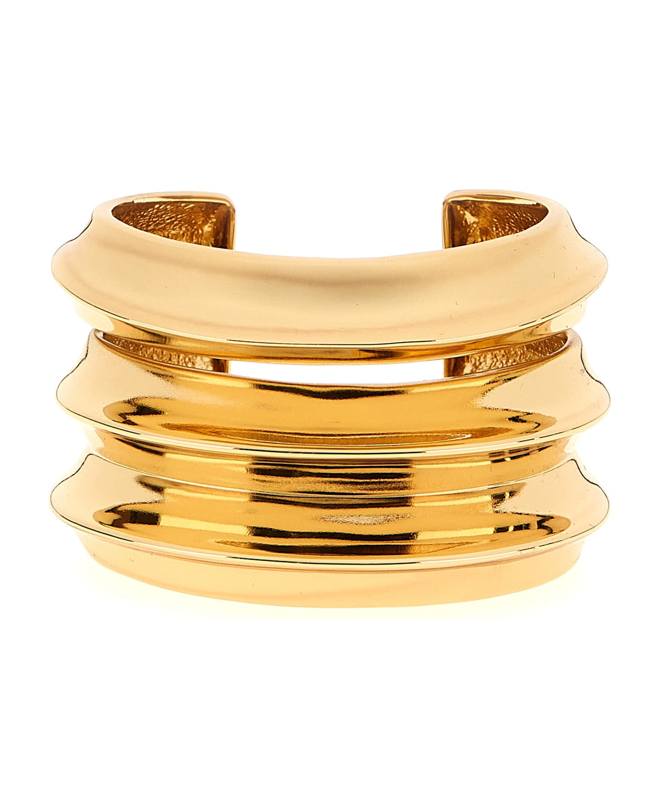 'Gold Sculpted Cuff' bracelet in gold metal, sculptural model on two levels.