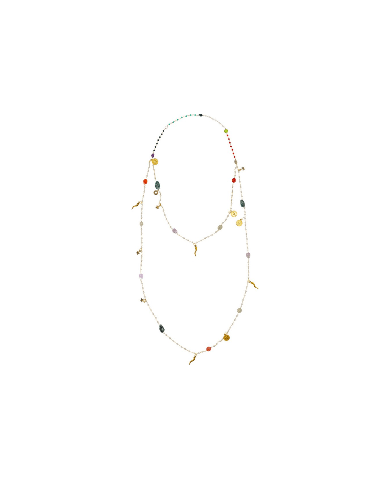 Lucky necklace by Àlmala, rosary style, made of golden brass, decorated with colored stones and metal charms.