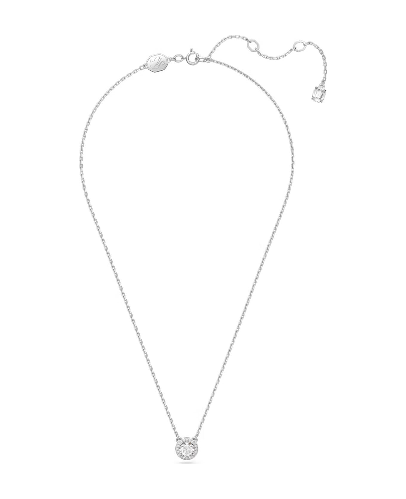 Constella necklace by SWAROVSKI in rhodium-plated metal, characterized by the round-cut crystal pendant with micro crystal pavé around. Adjustable closure with snap-hook enriched with an hanging crystal. (Maximum length: 44 cm)