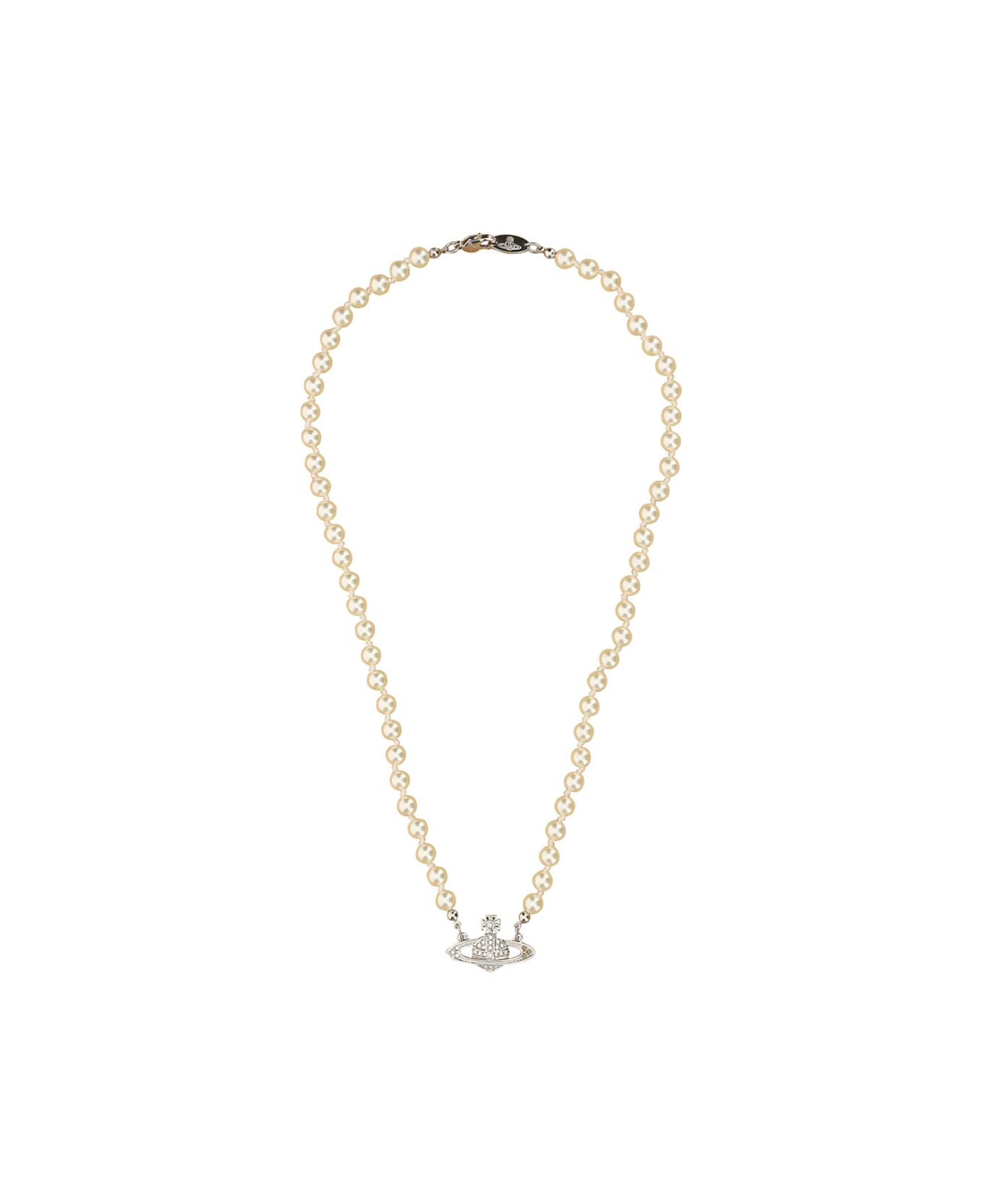 Pearl necklace by vivienne westwood, pendant on front with iconic silver-plated three-dimensional brand logo.