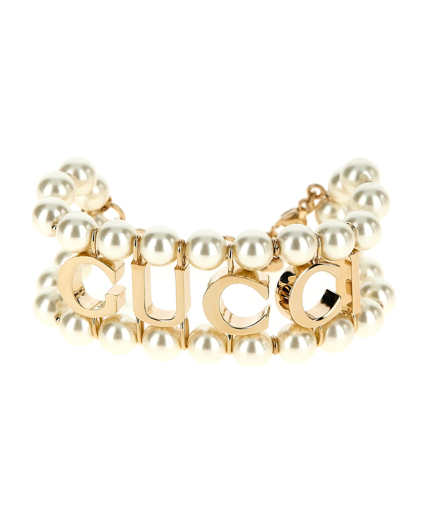 Metal bracelet with gold finish and glass beads, snap hook closure with GG. Composition: 100% brass