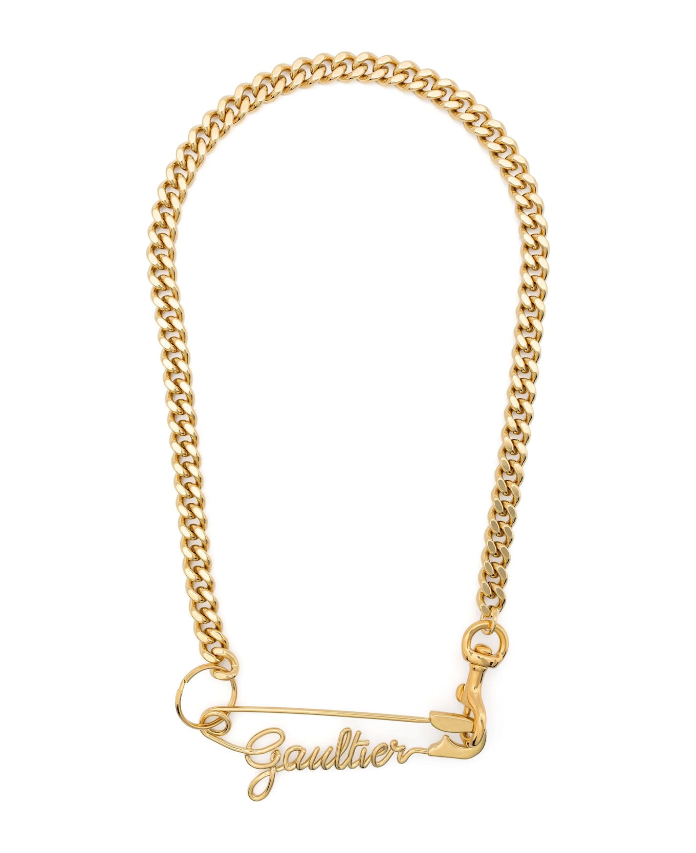 Gold metal chain necklace with front 'The Gaultier Safety Pin' and carabiner closure.