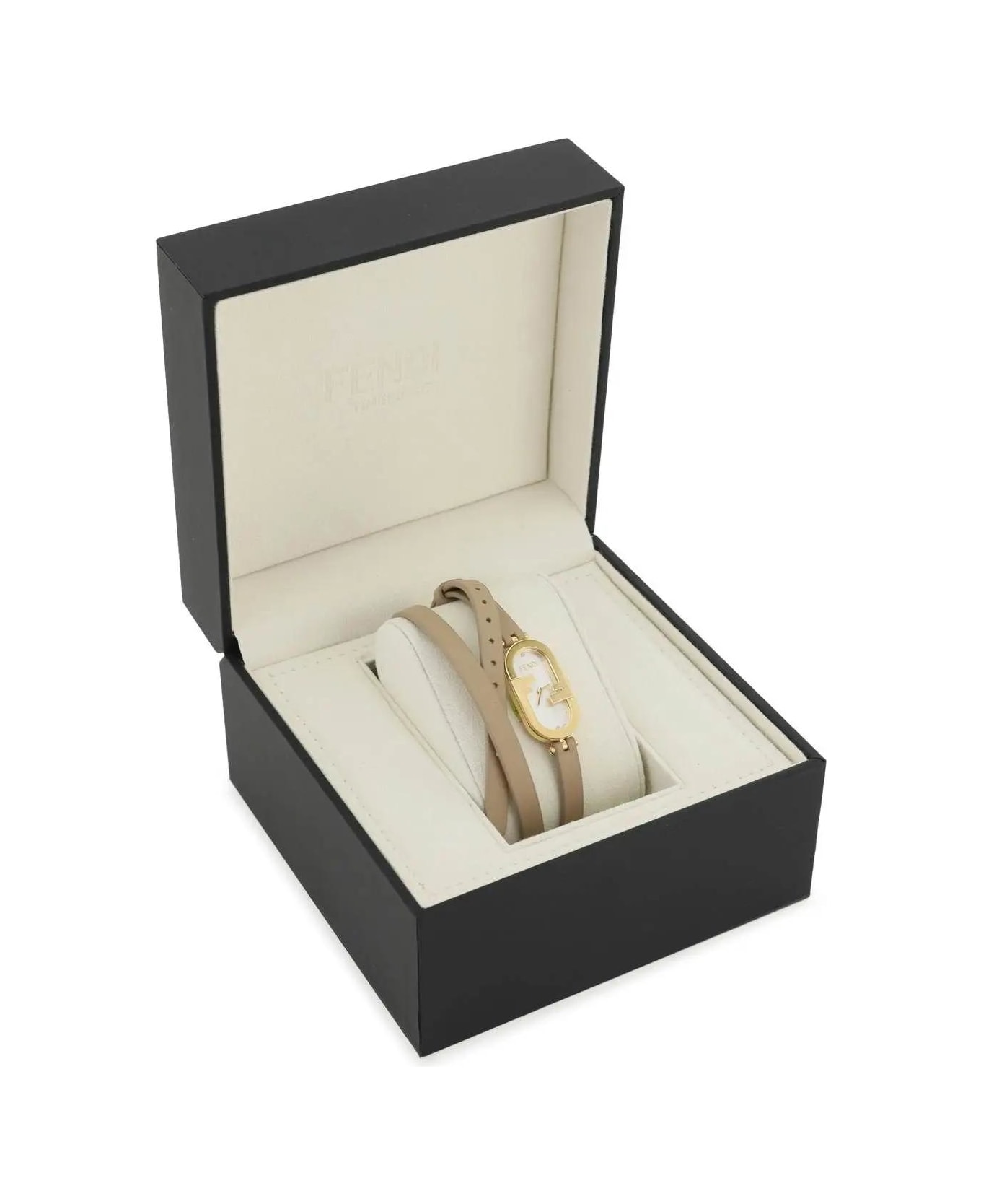 Gold-coloured stainless steel oval case 14. 80 x 28. 30 mm, with Fendi O Lock-shaped bezel. Crown with 1 inset diamond, around 0. 02 carats. Silver-coloured, sunray dial, indicators with inset diamonds at 12 o clock and 6 o clock, totalling around 0. 01 carats, gold-coloured minute and second hands with radius cut. Adjustable leather strap.