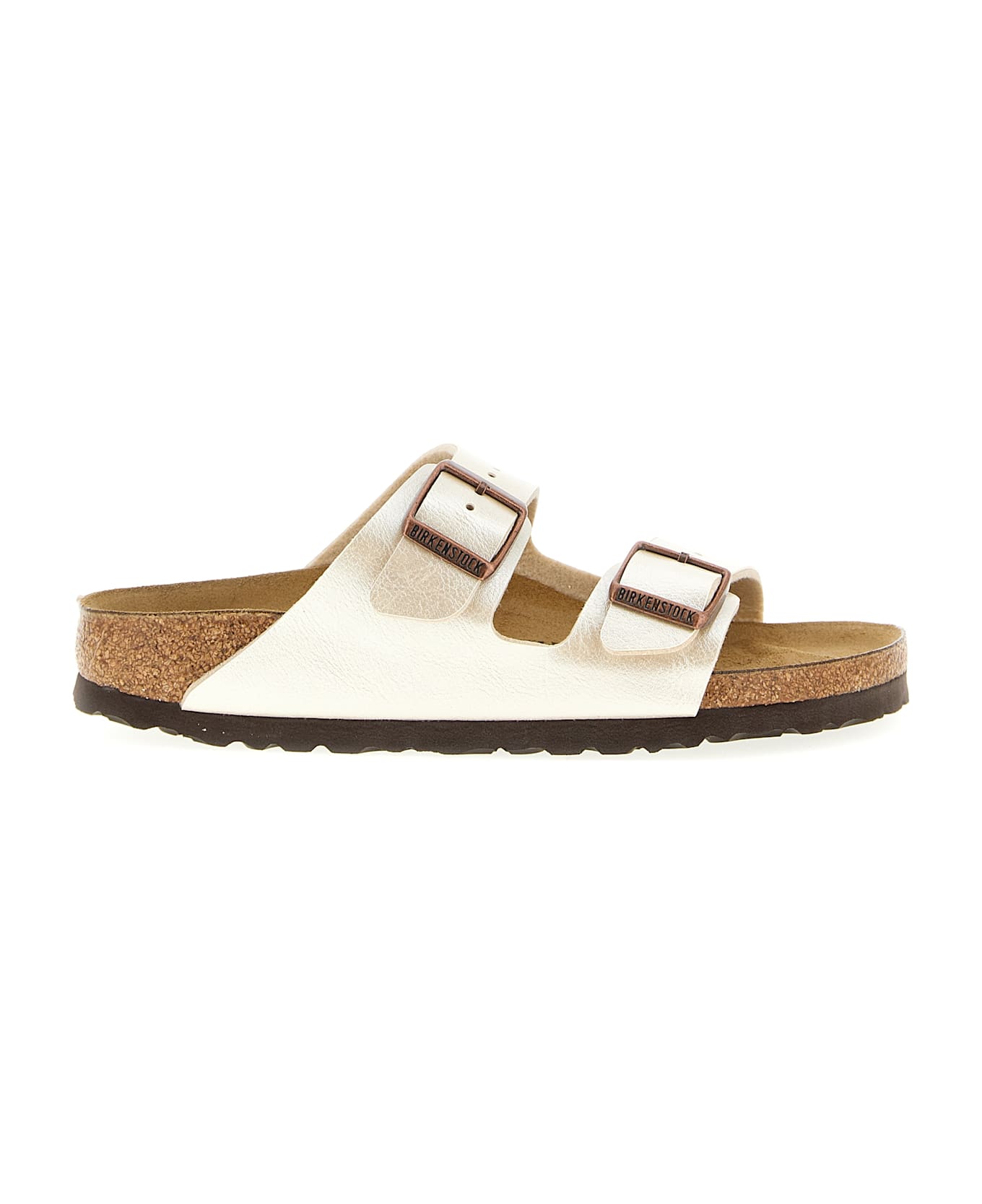 'Arizona' sandals in Birko-Flor® fabric with shiny silk effect coating, straps with adjustable antiqued metal buckles, anatomical cork and latex footbed, cork insole, EVA sole.