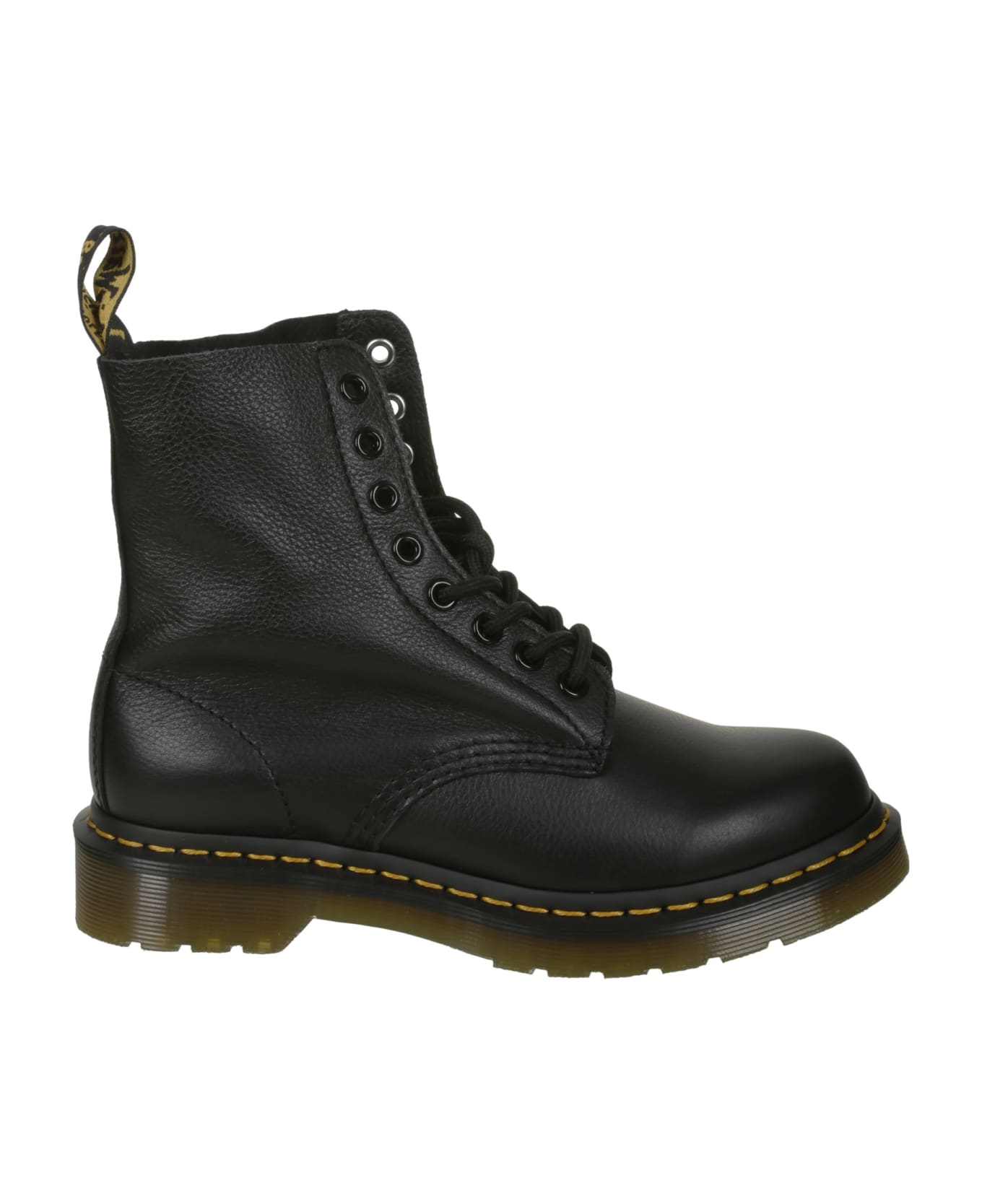 Dr. Martens Boot in black leather, 8-hole lacing, yellow stitching, PVC sole. Composition: 100% Leather