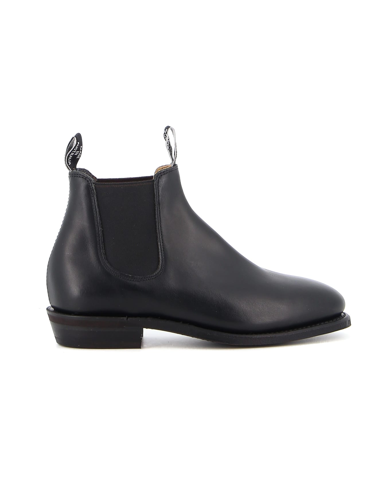 R. M. WILLIAMS Chalsea ankle boot, in black leather, side elastics, leather insole, straps with logo detail, rubber sole, round toe, handmade in Australia, made from a single piece of Italian leather.