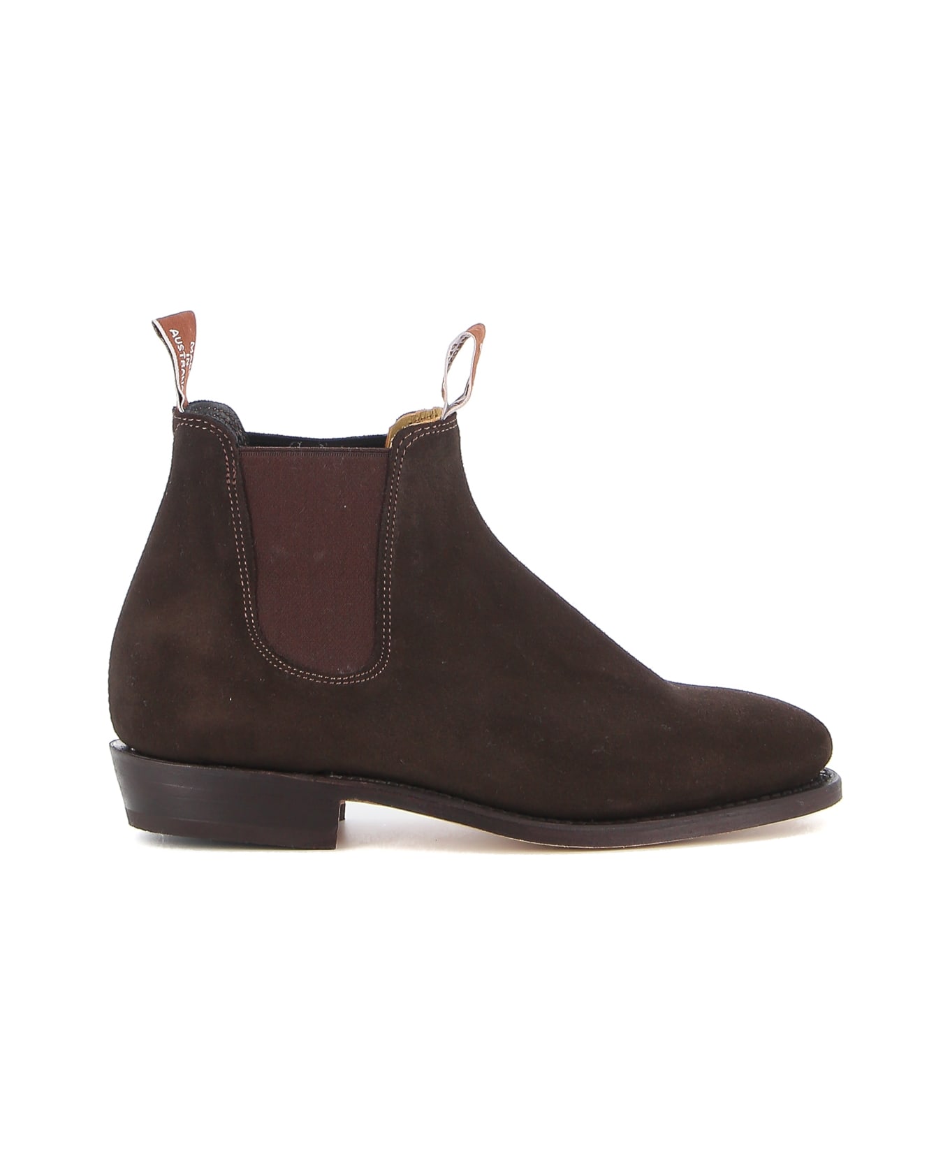 R. M. WILLIAMS Chalsea ankle boot, in brown suede, side elastics, leather insole, straps with logo detail, rubber sole, round toe, handmade in Australia, made from a single piece of Italian suede.
