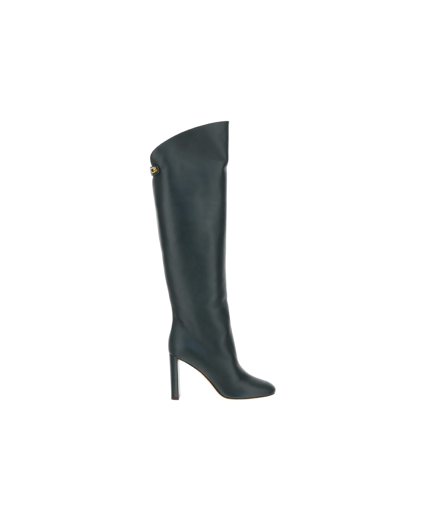 Calfskin adriana high boots by skorpios, almond toe, leather heel, knee-high boot, gold-plated ornament at back knee, smooth and shiny leather design.