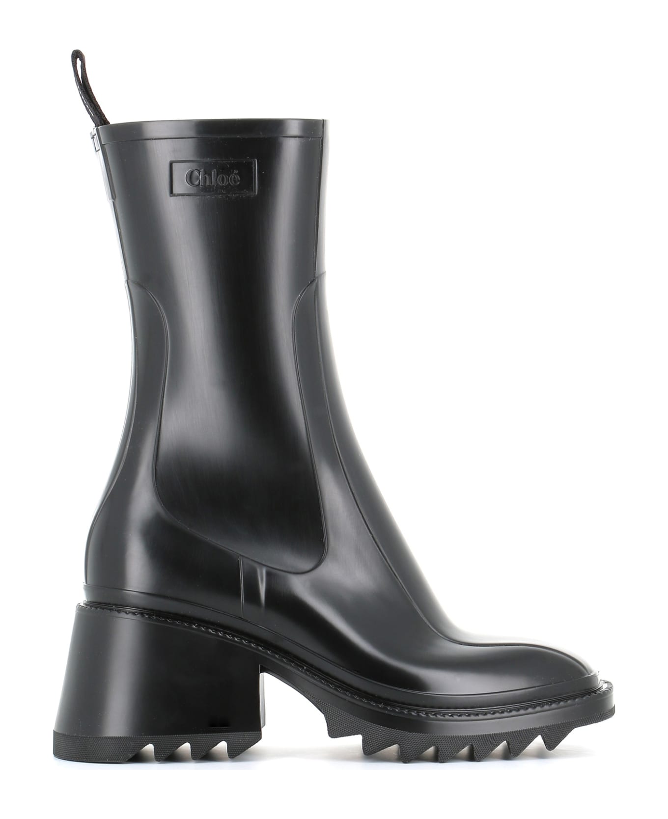 Black Rubber Ankle Boot from Chloé, featuring by a square toe, mid-calf length, rear tongue and low block heel. Interior lined in polyamide. Heel: 7,5 cm Composition: Plastica
