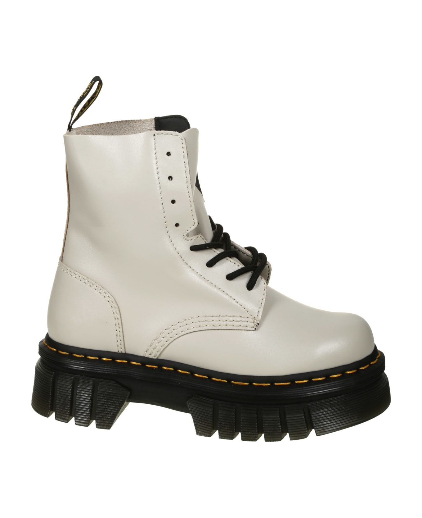 Dr. Martens White leather boots, visible stitching, non-slip rubber sole, lace-up closure. Composition: 100% Leather