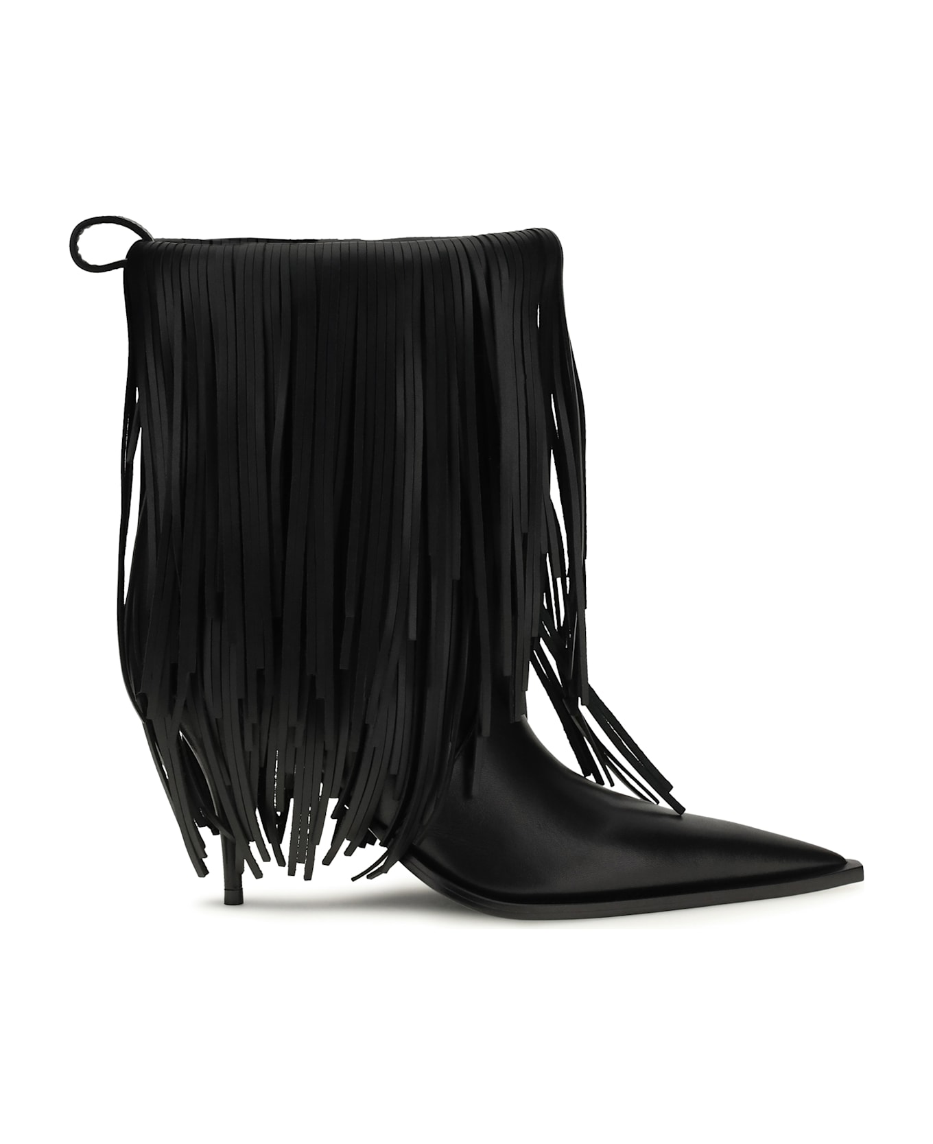 The avenue fringe ankle boots by balenciaga are a bold and sophisticated interpretation of women's footwear. crafted from matte calfskin leather, these ankle boots feature fringes decorating the upper, adding movement and a touch of originality. the elongated toe and slim, slender knife heel give them an elegant and contemporary silhouette. the loop at the back makes them easy to slip on, while the balenciaga logo embossed on the back completes the design with a distinctive detail. perfect for those seeking a mix of luxury and modernity, these ankle boots are ideal for a bold and sophisticated look.