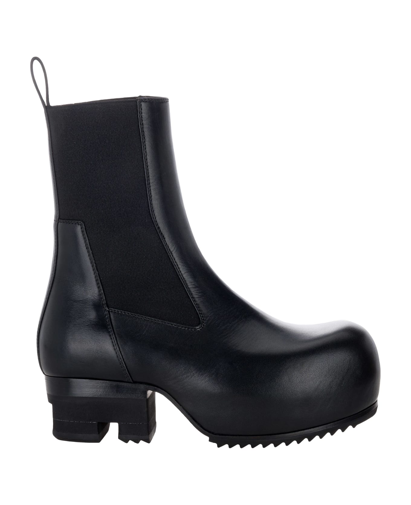 Black Leather Beatle Ballast Boots By Rick Owens. Featuring: - Rounded Bozo Toe; - Slip-on; - Elasicated Side Panels; - Rear Pull Tab; - Rubber Mega Creeper To The Front; - Toothed Sole; - Square Heel.