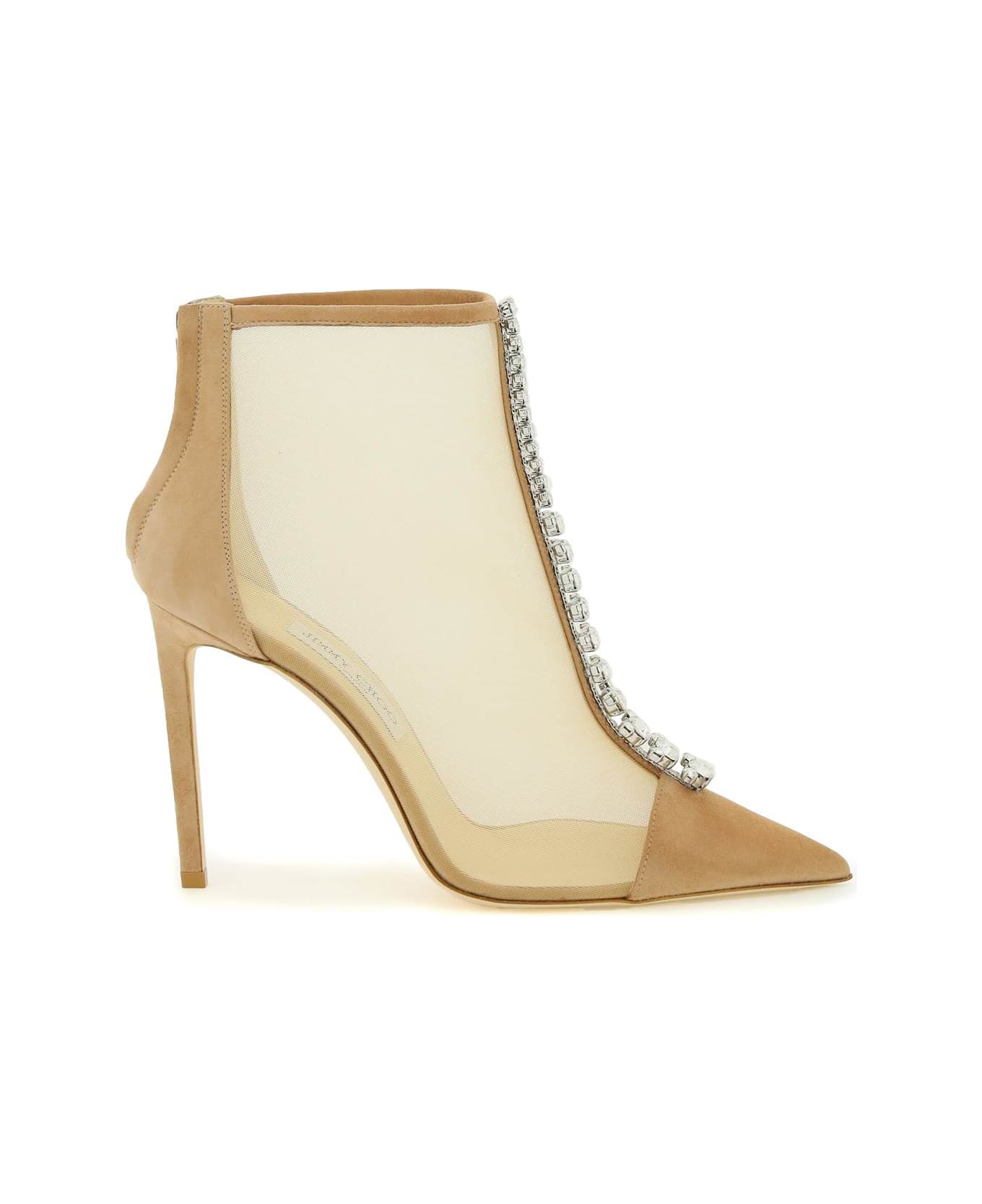 Bing ankle boots by Jimmy Choo in mesh with suede leather details, enriched with a crystal row applied on front. Pointed toe, rear zip closure, silver-finished metal zip puller with engraved logo, leather insole, suede-covered stiletto heel, leather sole.