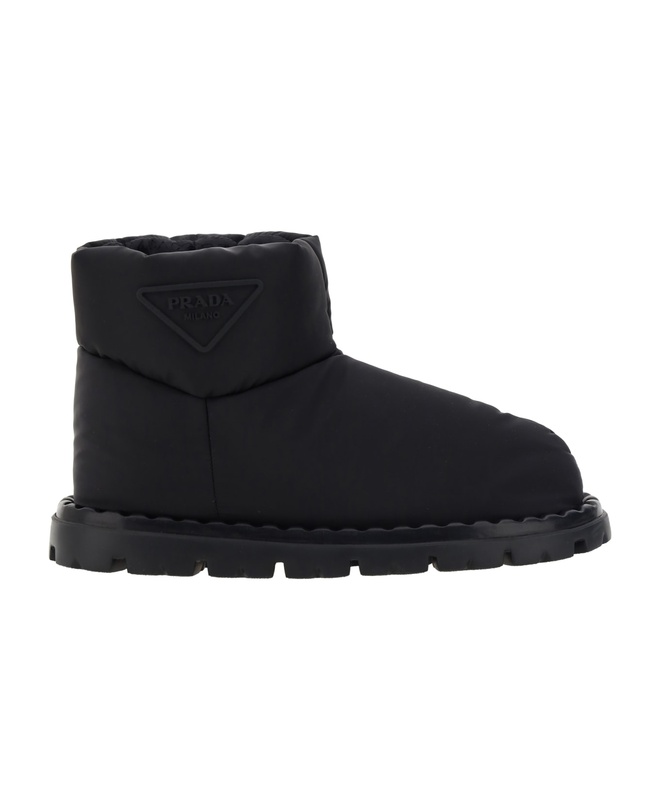 Blow ankle boots by prada, monochrome padded design, round toe, knurled sole, iconic triangular rubber plaque with brand signature applied to outer front panel. Composition: 100% % Rubber, 100% % Polyamide