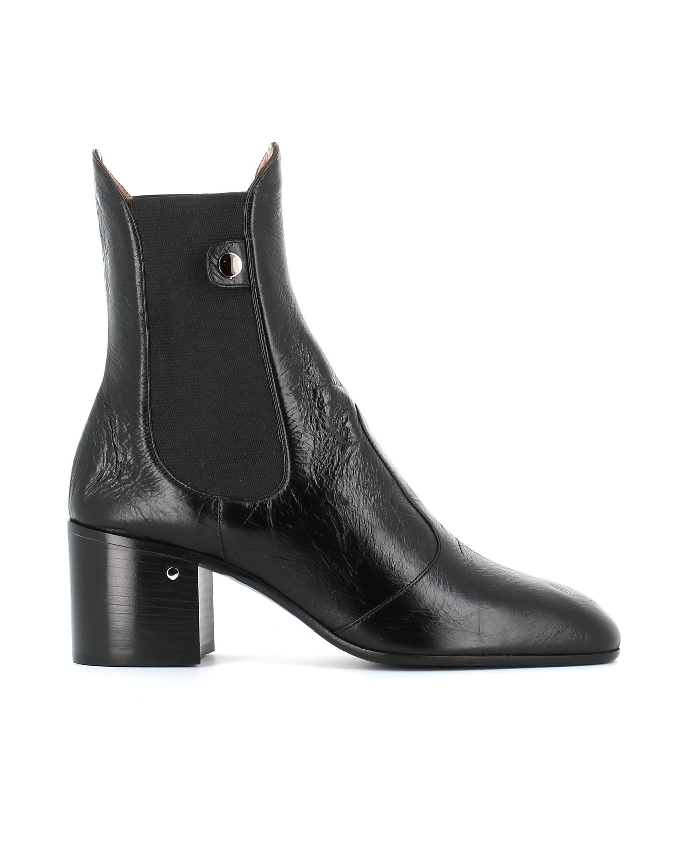 Black soft and semi-shine leather Ankle Boot from Laurence Dacade, featuring by lateral elastic inserts and a medium heel. Leather sole. Lined interior. Heel: 6 cm