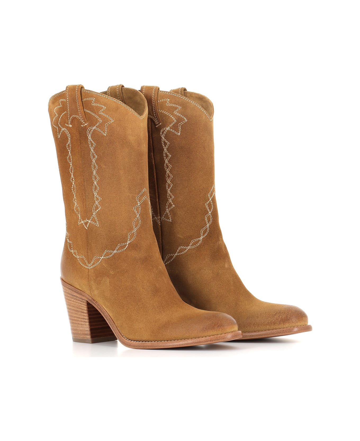 Copper soft suede Boot from Sartore, featuring by contrast embroideries on the leg and a almond toe. Lined interior. Leather fund. Heel: 8 cm