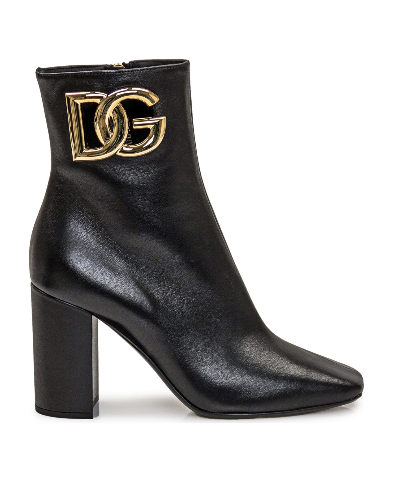 Black short boot. Zip closure. Metal DG logo. Square toe. Round heel. Composition: 100% Leather