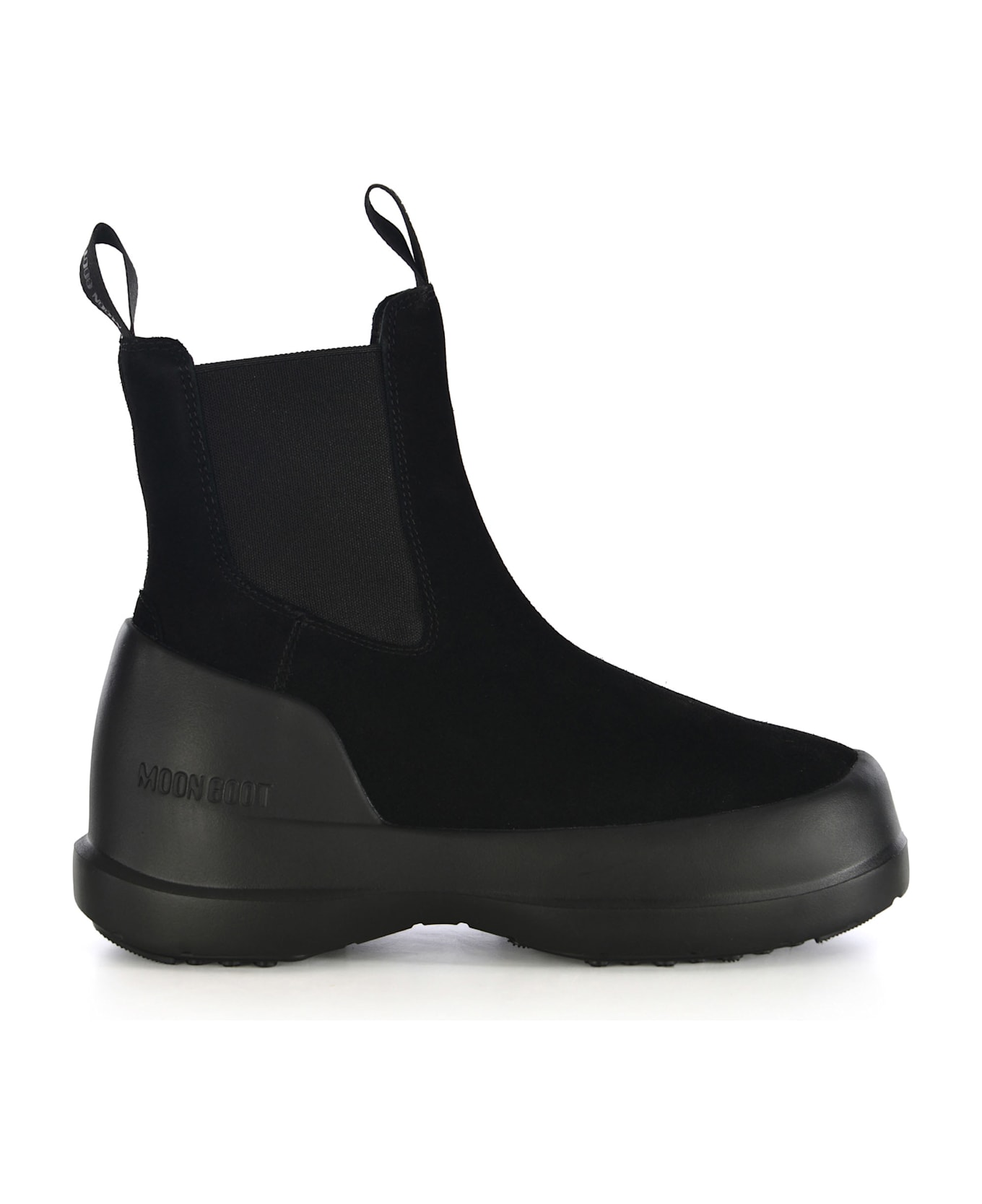 Ankle boots Moon Boot "Luna Chealsea" made of suede leather in Black. Elastic side inserts. Round toe. Pull tab on the front and back. Chunky rubber sole. "Moon Boot" logo lettering engraved in tone on tone. Ambidextrous. Non-slip rubber tread. Water-repellent. 100% Water-repellent Tread 75% Thermoplastic Rubber, 25% EVA Lining 77% Polyester, 23% Leather 80% Suede, 20% Polyester