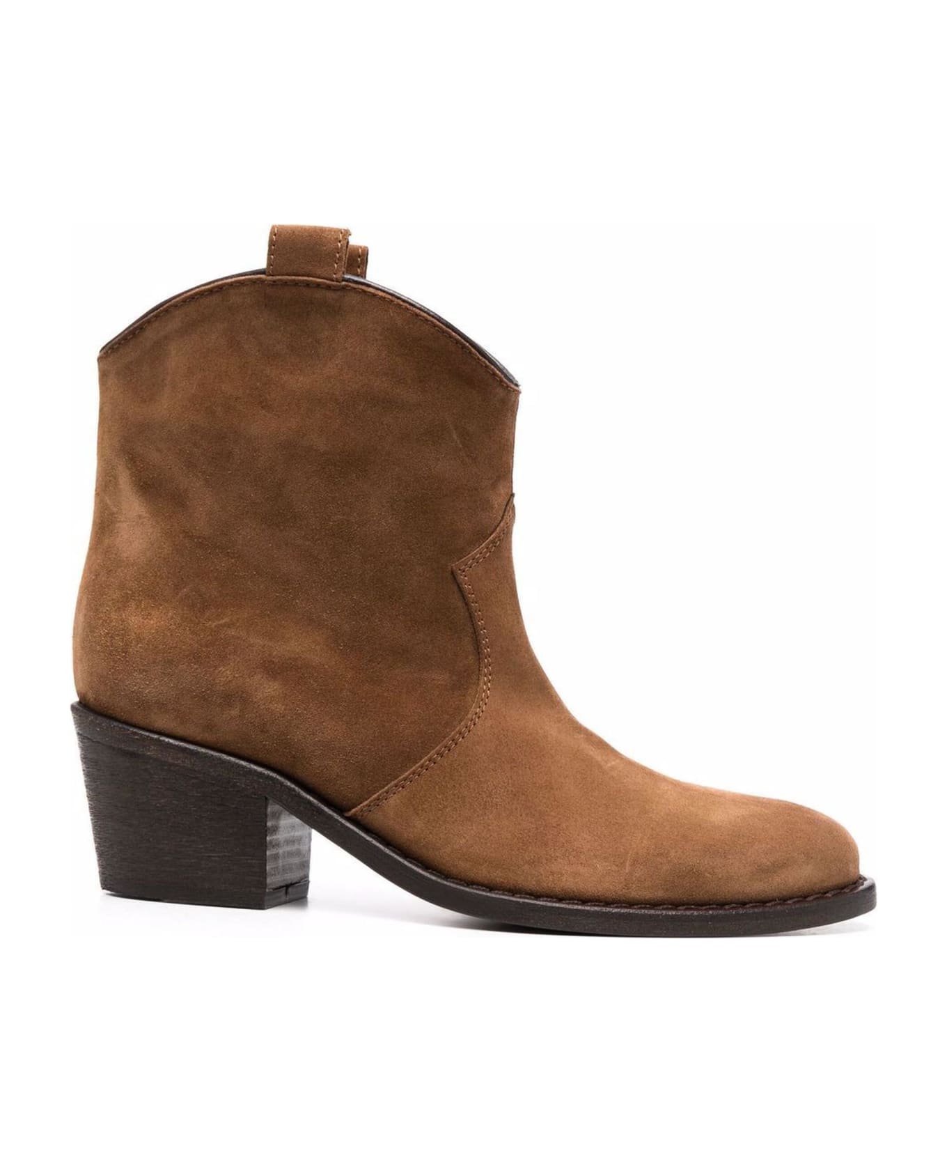 Brown suede ankle boot with contrasting stitching, block heel, leather sole, 6 cm heel height